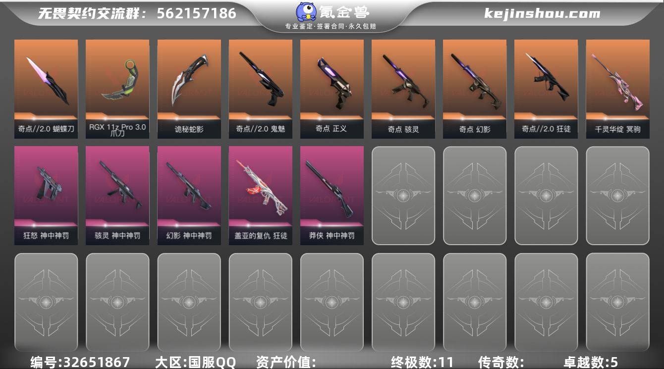 【qyz9513】奇点 神中神罚 紫金爪刀 qyz9513 【近战武器】:近战武器-神之刃,近战武器-奇点//2.0 蝴蝶刀,近战武器-紫金爪刀,近战武器-RGX 11z Pro//3.0 爪刀,近战武器-诡秘蛇影 军刀 【狂徒】:狂徒-奇点//2.0,狂徒-盖亚的复仇,狂徒-诡秘蛇影 【幻影】:幻影-奇点,幻影-神中神罚,幻影-末日之翼 【戍卫】:戍卫-战术熊与伙伴们,戍卫-折光棱晶 【冥驹】:冥驹-千灵华绽 【飞将】:飞将-战术熊与伙伴们,飞将-末日之翼 【莽侠】:莽侠-神中神罚,莽侠-诡秘蛇影,莽侠-纤云弄巧 【奥丁】:奥丁-流星兵团,奥丁-末日之翼 【判官】:判官-诡秘蛇影 【骇灵】:骇灵-奇点,骇灵-神中神罚,骇灵-流星兵团 【蜂刺】:蜂刺-纤云弄巧,蜂刺-折光棱晶 【标配】:标配-超能偶像,标配-战术熊与伙伴们,标配-折光棱晶 【正义】:正义-奇点,正义-纳米打击,正义-纤云弄巧 【鬼魅】:鬼魅-奇点//2.0,鬼魅-诡秘蛇影,鬼魅-星云暗涌 【狂怒】:狂怒-神中神罚,狂怒-战术熊与伙伴们 【短炮】:短炮-纤云弄巧,短炮-末日之翼 【卡面】:终章:激斗汉堡 卡面,进入射程 卡面,《双城之战》拥抱 卡面,精灵大战 卡面,欢迎来到底城 卡面,南瓜盛典 卡面,VCT CN首冠 卡面,奇点//2.0...