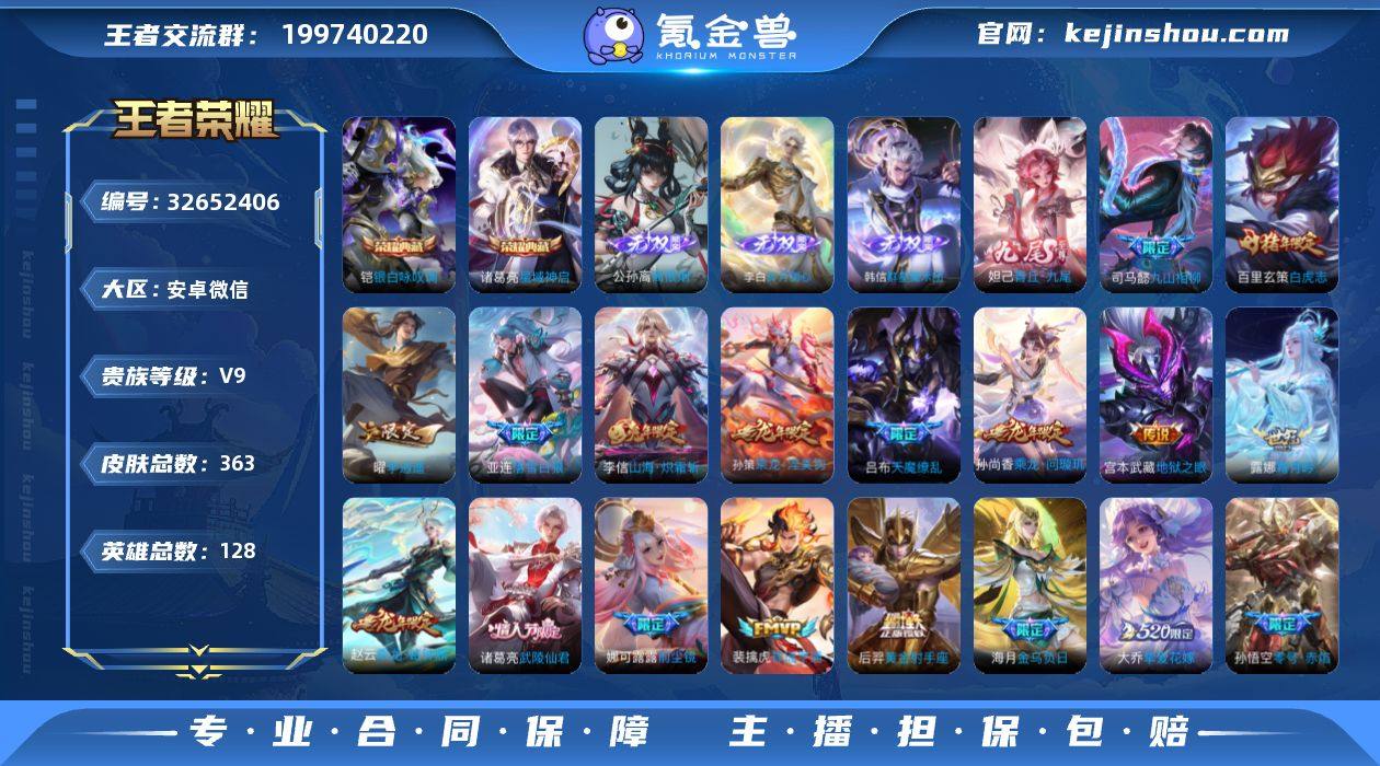 V9 2典藏 4无双 2珍品传说 47传说 128英雄 363皮肤 可修改实名 【英雄全皮】娜可露露全皮,敖隐全皮,空空儿全皮,孙权全皮,蚩奼全皮,黄忠全皮,海诺全皮,大司命全皮,大禹全皮 【稀有英雄】大司命,敖隐(小龙人),夏洛特(夏师傅),金蝉(唐僧),戈娅,赵云,嬴政(始皇帝),韩信(韩跳跳),艾琳,不知火舞,娜可露露(鸟人),橘右京(橘子) 【荣耀水晶】银白咏叹调(倪克斯侍卫),星域神启(倪克斯贼亮) 【无双皮】离恨烟(公孙离无双),碎月剑心(李白无双),青丘·九尾(妲己无双),韩信群星魔术团(韩信无双) 【珍品传说】黑崎一护,怪盗基德 【传说皮】挚爱花嫁,绛天战甲(鸡嘴战神),时之恋人-刘备(电焊工),琥珀纪元铠,乘龙·铭钟鼎(赵云年限),淬星耀世,典韦战鼓燎原,山海·炽霜斩(李信年限),挚爱之约,乘龙·淬吴钩(孙策年限),神树通天,末日机甲-孙尚香(绿蚂蚱),乘龙·问璇玑(孙尚香年限),金乌负日,乞巧织情,霜月吟,吕布曦玄引,黄金射手座,朵莉亚心动手记,音你心动-周瑜,九山相柳,地狱之眼,落雪白狼,惊梅引,祥瑞亨通,冠军飞将,零号·赤焰,李逍遥,琥珀纪元马超,云中君群星魔术团,青丘·九尾,死亡执政官,澜逐花归海,花朝如约(花篮子),貂蝉曦玄引,神骥·越千峰 【珍宝阁皮】玩趣恶龙,妄想食味,优雅恋人 【赛季...