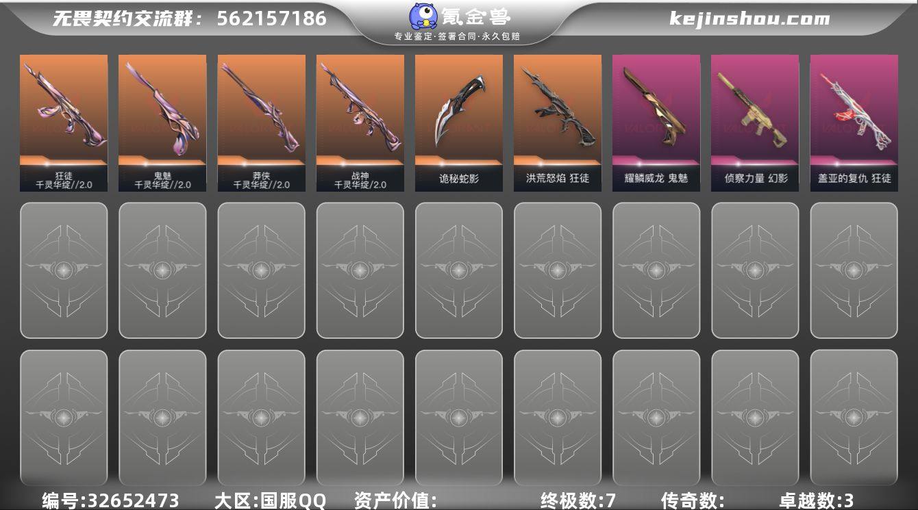 【套装】:千灵华绽//2.0套装【英雄】:幻棱,炼狱,维斯,暮蝶,钛狐,壹决,铁臂,捷风,幽影,不死鸟,贤者,猎枭,蝰蛇,零,芮娜,尚勃勒,霓虹,斯凯,夜露,K/O,盖可,黑梦,钢锁【近战武器】:近战武器-流风回雪,近战武器-诡秘蛇影 军刀【狂徒】:狂徒-洪荒怒焰,狂徒-千灵华绽//2.0,狂徒-盖亚的复仇,狂徒-诡秘蛇影【幻影】:幻影-侦察力量,幻影-末日之翼【戍卫】:戍卫-折光棱晶【飞将】:飞将-末日之翼【莽侠】:莽侠-千灵华绽//2.0,莽侠-诡秘蛇影【战神】:战神-千灵华绽//2.0【奥丁】:奥丁-末日之翼【判官】:判官-诡秘蛇影【蜂刺】:蜂刺-折光棱晶【标配】:标配-折光棱晶【正义】:正义-传奇制造【鬼魅】:鬼魅-千灵华绽//2.0,鬼魅-耀鳞威龙,鬼魅-诡秘蛇影,鬼魅-宿怨【短炮】:短炮-末日之翼【卡面】:Clutch 卡面,无畏契约GO!第一卷:芮娜 卡面,无畏契约GO!第一卷:零 卡面,代号红色 卡面,新兵报到 卡面,V契约 卡面,无畏契约 卡面【喷漆】:买装还是存钱 喷漆,胜利属于无畏契约 喷漆,GLHF 喷漆,无畏契约 喷漆【挂饰】:天外飞客 挂饰,无畏契约 纪念币 挂饰