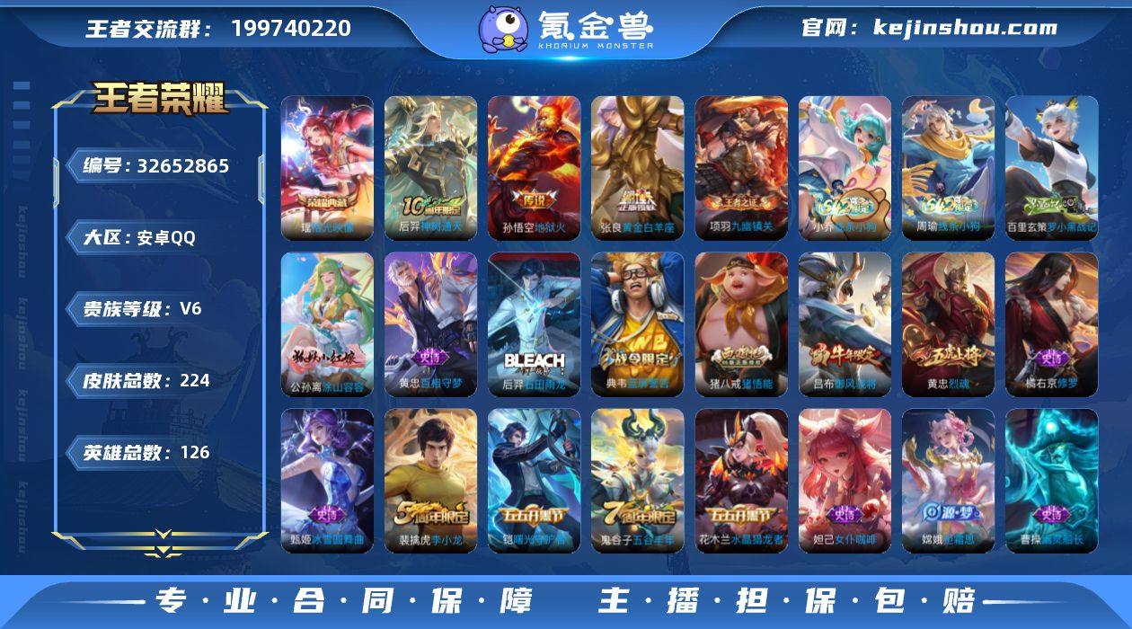 对抗路30的 发育路23的 星元幽冥之眼 安卓Q-V6-最强王者段位-126英雄-224皮肤-1典藏皮肤-3传说-62史诗 【英雄全皮】:孙权全皮 【荣耀典藏】:瑶拾光映像 【传说皮肤】:后羿神树通天,张良黄金白羊座,孙悟空地狱火 【限定皮肤】:姜子牙天穹之誓,狄仁杰阴阳师,赵云皇家上将,孙尚香蔷薇恋人,鲁班七号乒乒小将,庄周高山流水,高渐离死亡摇滚,高渐离玩趣恶龙,阿轲迷踪丽影,白起夜都怪侠,吕布御风骁将,夏侯惇朔风刀,典韦蓝屏警告,狄仁杰魔术师,狄仁杰万华元夜,达摩沙漠行僧,项羽海滩派对,项羽霸王别姬,老夫子醍醐杖,程咬金演武夺筹,刘邦夺宝奇兵,兰陵王金庭之子,牛魔御旌,李元芳云中旅人,钟馗驱傩正仪,干将莫邪胡桃夹子,雅典娜黎明之约,鬼谷子原初探秘者,鬼谷子五谷丰年,黄忠烈魂,苏烈千军破阵,百里玄策原初追逐者,弈星混沌棋,梦奇顽趣,沈梦溪大漠名商,明世隐疑决卦,明世隐吟游魔法,裴擒虎李小龙,裴擒虎擒涛扼浪,米莱狄御霄,云中君纤云弄巧,盾山御銮,猪八戒猪悟能,嫦娥拒霜思,鲁班大师探海日志,桑启海盐诗旅,鬼谷子天穹祈灯,沈梦溪龙舞盛年,刘邦剑破天穹,程咬金群星魔术团 【年限皮肤】:吕布御风骁将 【赛季限定】:米莱狄御...