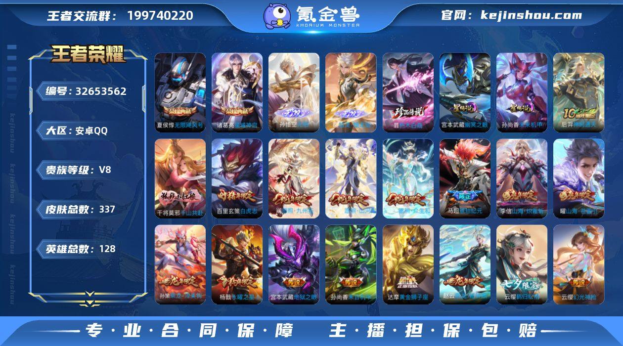 安卓Q-V8-最强王者段位-128英雄-337皮肤-2典藏皮肤-2无双-1珍品传说-28传说-106史诗【英雄全皮】:孙权全皮,敖隐全皮,司空震全皮,空空儿全皮【荣耀典藏】:夏侯惇无限飓风号,诸葛亮星域神启【无双皮肤】:孙悟空无相,曜器灵螭龙剑【珍品传说】:暃朽木白哉【传说皮肤】:关羽神骥镇沧海,后羿神树通天,干将莫邪千山共赴,司空震愿照山河定,妲己愿照众生和,澜愿照九州拓,云缨幻光神枪,桑启鸣野蒿,孙策乘龙淬吴钩,赵云乘龙铭钟鼎,马超琥珀纪元,云缨鹤归松栖,上官婉儿妄想奇谈,马可波罗妄想实况,伽罗炽翼辉光,曜山海苍雷引,李信山海炽霜斩,李白诗剑行,王昭君乞巧织情,虞姬启明星使,张良黄金白羊座,干将莫邪久胜战神,达摩黄金狮子座,百里玄策白虎志,花木兰冠军飞将,杨戬永曜之星,孙尚香末日机甲,宫本武藏地狱之眼【限定皮肤】:蔡文姬夏日便利店,大乔绒语心约,虞姬夏日便利店,姜子牙天穹之誓,狄仁杰阴阳师,赵云皇家上将,赵云引擎之心,庄周高山流水,高渐离死亡摇滚,高渐离玩趣恶龙,扁鹊奇幻香踪,芈月幻夜卜梦,吕布御风骁将,周瑜赤莲之焰,元歌云间偶戏,甄姬游园惊梦,马可波罗暗影游猎,马可波罗山海玄木吟,马可波罗妄想实况,狄仁杰...