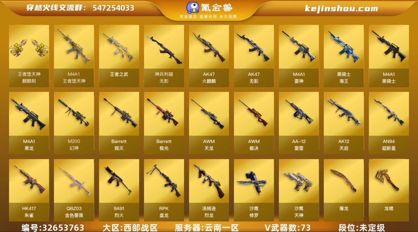 云南一区-86V-14王者武器数-0炫金武器数 【热门武器】:QBZ03-金色蔷薇*2,HK417-朱雀,M200-幻神,死亡之眼,C.A.T,M4A1-黑骑士*4,汤姆逊-烈龙*6,RPK-盘龙*6,加特林-炼狱*2,COP-白鲨,沙鹰-修罗*2 【王者炫金武器】:王者之武,M4A1-王者堕天神,麒麟刺-王者堕天神 【音效卡】:M4A1-雷神音效卡,M4A1-黑骑士音效卡,Barrett-毁灭音效卡,Barrett-极光音效卡,传情小小语音包 【皮肤】:幻神-动感闪耀 皮肤,幻神-曹操 皮肤,QBZ03-AG-CFPLS19冠军,裁决-胜者为王 皮肤,雷神-暗月,雷神-星空,雷神-虎将,雷神-传奇N9,雷神-宠儿-2019MVP,雷神-机甲刑天皮肤,火麒麟-AG战队皮肤,火麒麟-平天大圣,火麒麟-百城,火麒麟-心动糖果,毁灭耀金皮肤*2,毁灭-AG-CFPLS15冠军,毁灭-黑大圣皮肤,毁灭-英雄计划 皮肤,黑龙-能量核心,黑骑士耀金皮肤,无影-能量核心,天启-暗月,战神-粉色甜心皮肤,战神-紫绶金章皮肤,战神-流金岁月皮肤,天龙-能量核心,极光-能量核心,修罗-能量核心*2,龙啸-青青莓果 皮肤 【角色】:葵,樱,魅影,晴雅,王者炫,王者玲珑-小乔,堕落女神,幻面灵狐,暗夜-X,北极狐-X,芳心审判者,风暴女,娟娟,灵狐-花神,灵狐者-黄金海岸,灵狐者-...