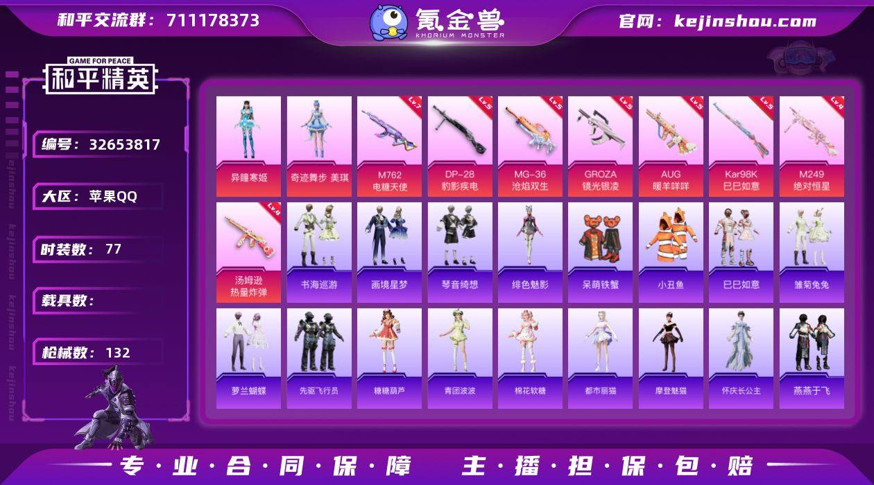 苹果 手Q-3粉装-11特效枪-0载具-2粉色飞行器-37950热力值-6王牌印记-77套装-132枪皮【热门品类】:套装-小丑鱼【粉色套装】:角色-奇迹舞步 美琪,角色-异瞳寒姬【粉色枪皮等级】:GROZA-镜光银凌(五级),AUG-暖羊咩咩(五级),M762-电糖天使(七级),UMP45-萌骑冒险(二级),汤姆逊-热量炸弹(四级),AKS-74U-森灵之息(四级),Kar98K-巳巳如意(五级),Mk14-福马献瑞(四级),M249-绝对恒星(四级),DP-28-豹影疾电(五级),MG-36-沧焰双生(五级)【粉色枪皮】:GROZA-镜光银凌,AUG-暖羊咩咩,M762-电糖天使,UMP45-萌骑冒险,汤姆逊-热量炸弹,AKS-74U-森灵之息,Kar98K-巳巳如意,Mk14-福马献瑞,M249-绝对恒星,DP-28-豹影疾电,MG-36-沧焰双生【粉色飞行器】:炫彩糖果飞行器,星空武士飞行器【粉色降落伞】:绝对恒星降落伞,精灵梦叶罗丽降落伞,千金淑猫降落伞,月影灵韵降落伞,智耀战神降落伞,奇迹舞步降落伞,无垠阁降落伞,炫彩糖果降落伞【稀有套装】:套装-巳巳如意,套装-雪国风尚,套装-炫彩糖果,套装-马上来财,套装-雏菊兔兔,套装-萝兰蝴蝶,套装-先驱飞行员,套装-糖糖葫芦,套装-青团波波,套装-棉花软糖,角色-都市丽猫,角色-摩登魅猫,角色-怀庆长公主,套...