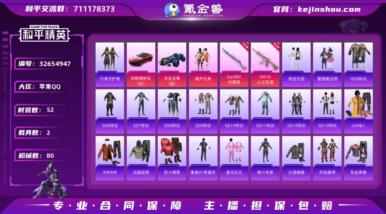 苹果 手Q-1粉装-2特效枪-2载具-1粉色飞行器-25737热力值-1王牌印记-52套装-80枪皮 【热门品类】:套装-沙漠守护者 【粉色套装】:粉装-葫芦兄弟 【粉色枪皮等级】:M416-心之恋语(二级),Kar98K-伏魔团(四级) 【粉色载具】:阿斯顿马丁DBS(红),合金龙骨(蓝) 【粉色枪皮】:M416-心之恋语,Kar98K-伏魔团 【粉色飞行器】:梦幻火箭飞行器 【粉色降落伞】:春暖花开降落伞,PEL轰鸣竞梦者降落伞,神秘黑猫降落伞,古堡领主降落伞,旋转彩虹降落伞 【稀有枪皮】:AKM-灼热熔岩,AKM-霓虹街区,M16A4-机械英豪,M16A4-红色方程式,SCAR-L-红色方程式,M416-仓鼠灰灰,M416-夜灯,M416-神秘黑猫,GROZA-黑色刀锋,QBZ-原初圣火,M762-动感兔斯基,M762-拳皇97,M762-牛气冲天,M762-诡娃娃,G36C-不夜海上花,UZI-众神之王,UZI-红色方程式,UMP45-蓝色火焰,Vector-彩虹符号,Vector-生命誓言,Vector-黑色刀锋,汤姆逊-奇异狩猎者,野牛-机械英豪,MP5K-众神之王,Kar98K-华贵君王,Kar98K-梦幻火箭,M24-众神之王,AWM-不夜海上花,SKS-夜灯,VSS-黑色刀锋,Mini14-原初圣火,Mini14-春暖花开,Mini14-梦幻火箭,Mini14-炫彩节奏,Mini14-阿狸红,Win94-机械英豪,SLR-众神...