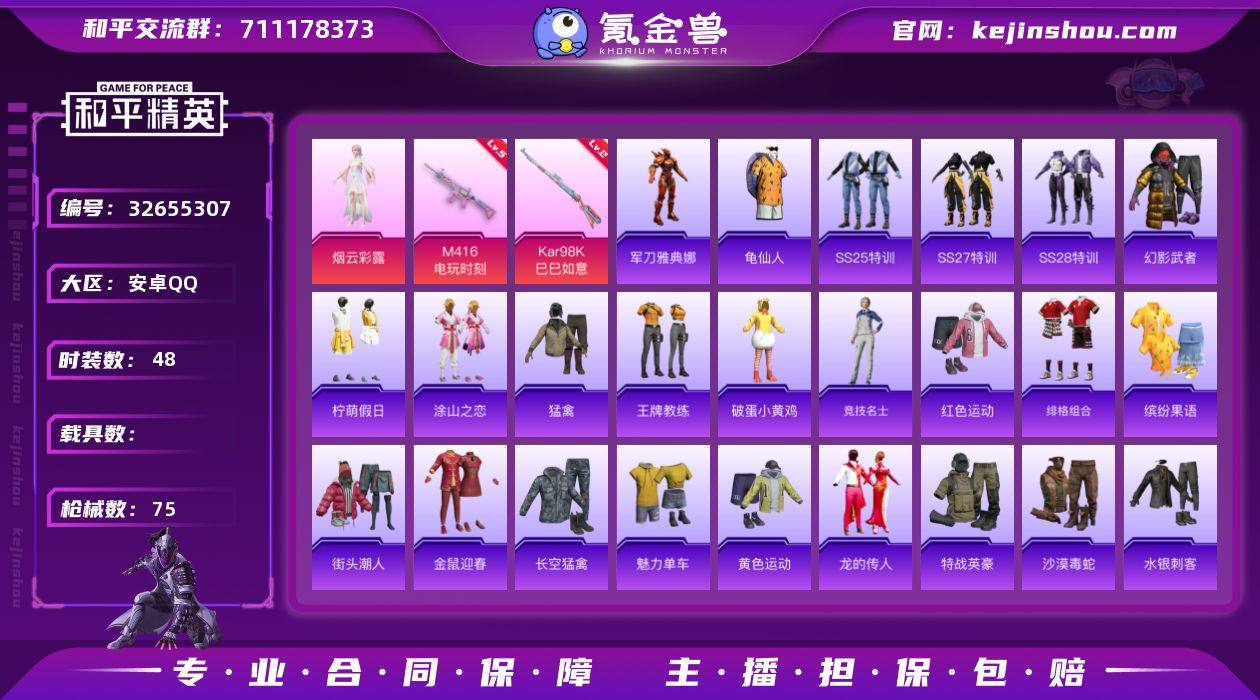 安卓 手Q-1粉装-2特效枪-0载具-2粉色飞行器-19008热力值-2王牌印记-48套装-75枪皮 【热门品类】:角色-军刀雅典娜,套装-龟仙人 【粉色套装】:角色-烟云彩露 【粉色枪皮等级】:M416-电玩时刻(五级),Kar98K-巳巳如意(二级) 【粉色枪皮】:M416-电玩时刻,Kar98K-巳巳如意 【粉色飞行器】:闪光银龙飞行器 【粉色降落伞】:暖熊萌萌降落伞,圣堂之誓降落伞,江南烟雨降落伞,创世·救赎降落伞,忍者神龟降落伞 【稀有套装】:套装-龟仙人 【稀有枪皮】:AKM-破晓战魂,AKM-龙的传人,SCAR-L-红色方程式,M416-糯团青竹,M416-红色方程式,AUG-耀粉歌者,M762-天降萌叽,AC-VAL-闲梦青缨,蜜獾-天降萌叽,UZI-天降萌叽,UZI-红色方程式,UMP45-涂山之恋,Vector-焰鹰斗篷,Vector-彩虹符号,Vector-音爆索尼克,Vector-创世·救赎,汤姆逊-耀粉歌者,P90-巳巳如意,Kar98K-彩虹符号,M24-拂晓神骑,AWM-焰鹰斗篷,SKS-炫彩节奏,SKS-糯团青竹,SKS-金玉无双,VSS-彩虹符号,Mini14-耀粉歌者,Mini14-金玉无双,M417-惊鸿侠骨,M200-惊鸿侠骨,S686-红色方程式,S686-巳巳如意,S1897-炫彩节奏,S12K-玩趣呆呆,S12K-破晓战魂,DBS-焰鹰斗篷,DBS-创世·救赎,M249-彩虹符号,M249...