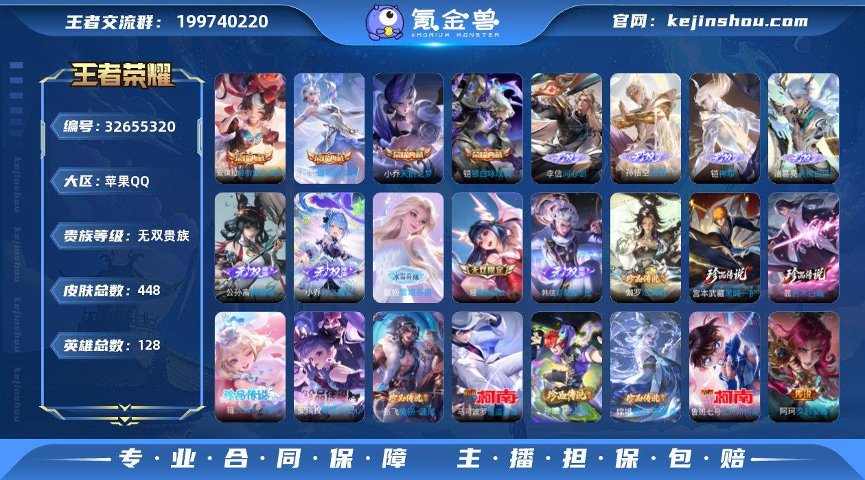 实名: 可修改 性别: 女号 贵族等级: 无双贵族 英雄数: 128 皮肤数: 448 荣耀水晶: 天鹅之梦,银白咏叹调,最初的交响,颠倒童话·魔镜 无双皮: 真我赫兹(瑶),小乔时之魔女,韩信群星魔术团,离恨烟,雪境奇遇-甄姬,天机白泽,神罪,无相,问心剑 珍品传说: 江户川柯南,怪盗基德,时之奇旅-孙策,器灵·落星盏,兔狲·蓬尾,酷洛米之心,大耳狗之梦,朽木白哉,黑崎一护,沧流箭 传说皮: 冠军飞将,云鹰飞将,猫影幻舞,久胜战神,炽阳神光,一念神魔,云霓雀翎,末日机甲-孙尚香,地狱火,仲夏夜之梦,音你心动-小乔,海洋之心,飞鸢探春,乞巧织情,时之恋人-刘备,游龙清影,淬星耀世,超时空战士-狄仁杰,花朝如约,挚爱之约,挚爱花嫁,无双飞将,音你闪耀,山海·琳琅生,炽翼辉光,燃星之曲,画中仙,电玩·雷克斯,灼幽烈阳,大乔-时之奇旅,小动物乐团,霜月吟,澜逐花归海,艾琳觅芳踪,乘龙·问璇玑,典韦战鼓燎原,金乌负日,朵莉亚心动手记,牧神诗旅,玄雷天君,幻光神枪,祥瑞亨通,星之鸣奏,续相思,云诺千山,九山相柳,死亡执政官,诡秘之主,千山共赴,万灵伏威,神树通天,纵目迁山,长夜焕生,神骥·赴朔漠,神骥·鸣幻洲,神骥·越千峰,神骥·逐星野,神骥·镇沧海,神骥·聚万邦,星君·娄金,异界灵契-花木兰,踏浪归,罗刹妄海 限定皮: 李小龙,梁...