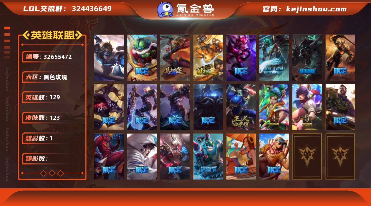 实名: 可修改 英雄数: 129 皮肤数: 123 炫彩数: 1 赛季限定皮: 胜利枪神 格雷福斯 冠军限定系列: S3 SKT T1 李青,S4 SSW 泰隆,S13 T1 李青 冰雪节限定: 邪恶圣诞老人 维迦 泳池派对: 泳池派对 蕾欧娜,泳池派对 李青 年限: 美猴王 孙悟空,替父从军 花木兰 周年: 4周年 锐雯,5周年 阿狸 其他限定/神话皮: 防暴天使 凯尔,暗影 沃里克,地底世界 崔斯特,都铎王朝 图奇,冠军之刃 锐雯,冠军之刃 锐雯 2016,冠军之隐 劫,警用试作体K-9 内瑟斯,勇者 阿狸,外星装甲 库奇 亮点: 【优质装备】:防暴天使 凯尔,暗影 沃里克,地底世界 崔斯特,都铎王朝 图奇,冠军之刃 锐雯,冠军之刃 锐雯 2016,冠军之隐 劫,警用试作体K-9 内瑟斯,勇者 阿狸,未来战士,冠军之刃 锐雯 2016 凯旋圣装,外星装甲 库奇
