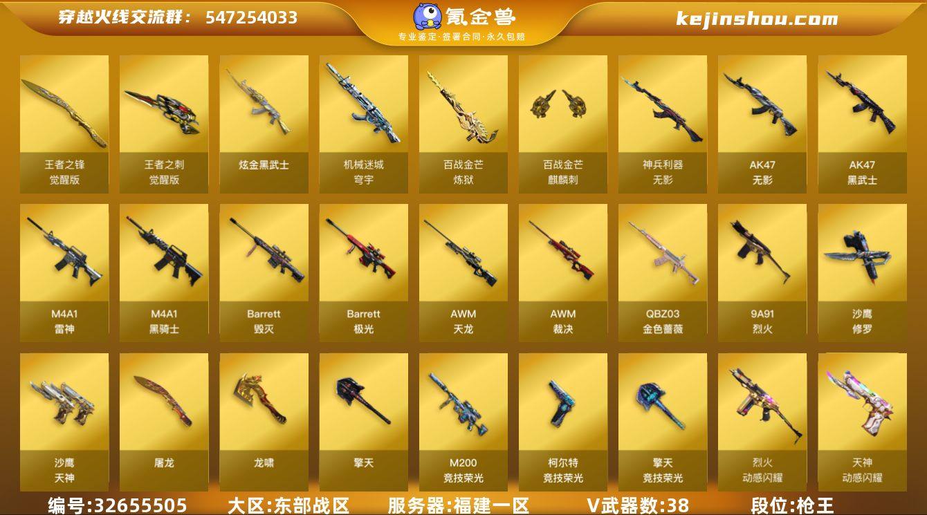 福建一区-44V-2王者武器数-1炫金武器数 【热门武器】:QBZ03-金色蔷薇,M200-竞技荣光,M4A1-黑骑士*2,沙鹰-修罗 【王者炫金武器】:炫金武士 【音效卡】:M4A1-雷神音效卡,M4A1-黑骑士音效卡,Barrett-碧霄极光音效卡,麒麟刺-百战金芒-盛典舞曲音效卡,炼狱-百战金芒-庆典舞曲音效卡 【皮肤】:AWM-裁决-凤灵皮肤,雷神-暗月,雷神-耀金皮肤*2,雷神-宇航兔皮肤*2,M4A1-再燃火线,雷神-神秘按键 皮肤,火麒麟-雷神*2,毁灭-虹光风暴 皮肤,毁灭-英雄计划 皮肤,M4A1-千变-孔明皮肤,黑骑士-暗月,极光-能量核心,极光-高能霹雳 皮肤,修罗-星空,屠龙-春桃 皮肤,轻型军用手斧-再燃火线 【角色】:零,电竞教官-云悠悠,零·纪元,王者春,乔伊教练,葵-阿尔法武装,幻面灵狐,暗夜-X,初恋灵狐,芳心审判者,风暴女*2,虎妞,嘉年华灵狐,娟娟,龙儿,龙儿-小淘气,麻雀,潘多拉-甜心教官,青霞仙子,蜀雪,铁骑荣耀,兔囡囡,潘多拉-N 【人偶武器】:迷你钢铁终结者,迷你地狱终结者,AWM-灵狐-15周年嘉年华*2,M37-葵,迷你深渊冰龙,迷你波特博士,夺魂,迷你火种*2,生化手雷-机甲核心,深渊终结者手雷 【挑战大师】:冰龙粉碎者-白马银枪,激光毁灭者III-白马银枪,...
