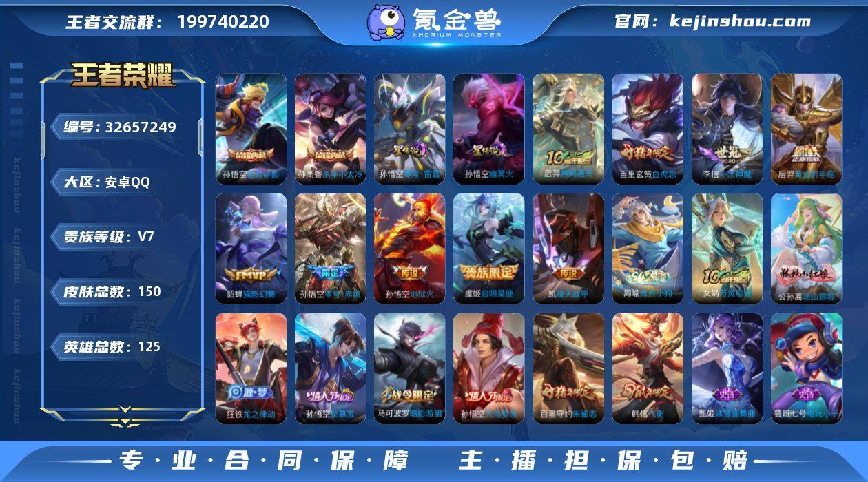 【孙悟空孙尚香典藏9个高质量传说多限定】安卓Q-V7-永恒钻石IV段位-125英雄-150皮肤-2典藏皮肤-9传说-39史诗【荣耀典藏】:孙悟空全息碎影,孙尚香杀手不太冷【传说皮肤】:后羿神树通天,铠绛天战甲,虞姬启明星使,孙悟空零号赤焰,李信一念神魔,貂蝉猫影幻舞,百里玄策白虎志,后羿黄金射手座,孙悟空地狱火【限定皮肤】:狄仁杰阴阳师,虞姬凯尔特女王,赵云皇家上将,周瑜赤莲之焰,夏侯惇朔风刀,马可波罗暗影游猎,狄仁杰魔术师,狄仁杰万华元夜,达摩沙漠行僧,项羽海滩派对,老夫子醍醐杖,程咬金演武夺筹,韩信飞衡,兰陵王驯魔猎人,兰陵王金庭之子,孙悟空至尊宝,孙悟空大圣娶亲,孙悟空零号赤焰,李元芳银河之约,李元芳云中旅人,虞姬启明星使,钟馗驱傩正仪,干将莫邪胡桃夹子,雅典娜单词大作战,鬼谷子原初探秘者,鬼谷子五谷丰年,苏烈千军破阵,百里玄策白虎志,百里守约朱雀志,弈星混沌棋,沈梦溪星空之诺,沈梦溪大漠名商,明世隐疑决卦,裴擒虎李小龙,裴擒虎擒涛扼浪,米莱狄御霄,盾山御銮,猪八戒西部大镖客,上官婉儿梁祝,蒙犽狂想玩偶喵,桑启海盐诗旅【年限皮肤】:百里玄策白虎志,百里守约朱雀志,韩信飞衡【赛季限定】:虞姬凯尔特女王,...