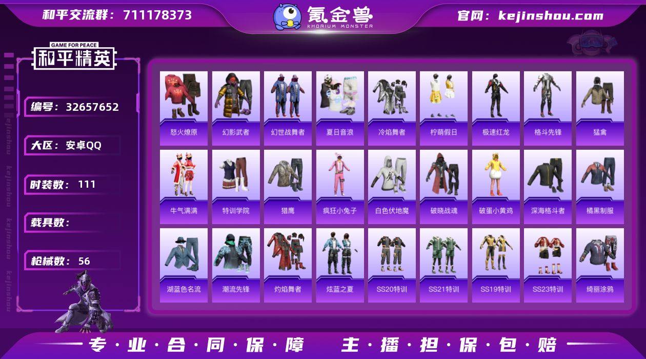 HM6745安卓Q区-1特效枪-地铁已开-17186热力值-71套装-56枪皮【稀有武器皮肤】: GROZA-海盐豹豹 M416-蓝色火焰 M416-糯团青竹 AKM-彩虹符号 AKM-破晓战魂 AKM-龙的传人 AKM-虎虎生威 SCAR-L-红色方程式 SCAR-L-玉兔迎春 AUG-耀粉歌者 QBZ-赛罗 QBZ-原初圣火 M762-牛气冲天 M762-天降萌叽 Mk47-乌木金纹 G36C-乌木金纹 AC-VAL-乌木金纹 Kar98K-乌木金纹 Kar98K-炫彩节奏 M24-乌木金纹 AWM-天降萌叽 莫辛纳甘-乌木金纹 SKS-迅猛狂鲨 SKS-心之恋语 SKS-糯团青竹 VSS-乌木金纹 Mini14-原初圣火 Mini14-炫彩节奏 Mk14-乌木金纹 QBU-锦绣火鲤 UZI-天降萌叽 UMP45-蓝色火焰 UMP45-生命誓言 汤姆逊-耀粉歌者 汤姆逊-天降萌叽 汤姆逊-乌木金纹 野牛-乌木金纹 野牛-夜灯 P90-乌木金纹 S1897-神秘黑猫 S1897-乌木金纹 S12K-破晓战魂 DBS-彩虹符号 M249-乌木金纹 M249-四圣焕新 DP-28-彩虹符号 DP-28-乌木金纹 DP-28-原初圣火 MG3-幻世战舞者 P18C-原初圣火 平底锅-原初圣火【其他套装】: 龟仙人 战术大师 SS16特训 福星高照 都市漫游者 虎虎生威吉莉 夏日音浪 龙的传人 青玉碎影 特训学院 猎鹰 青年教官 橘黑制服 红色运动 黄色运动 蓝色运动 黄色伏地魔 白色伏地魔 深海格斗者 湖蓝色名...