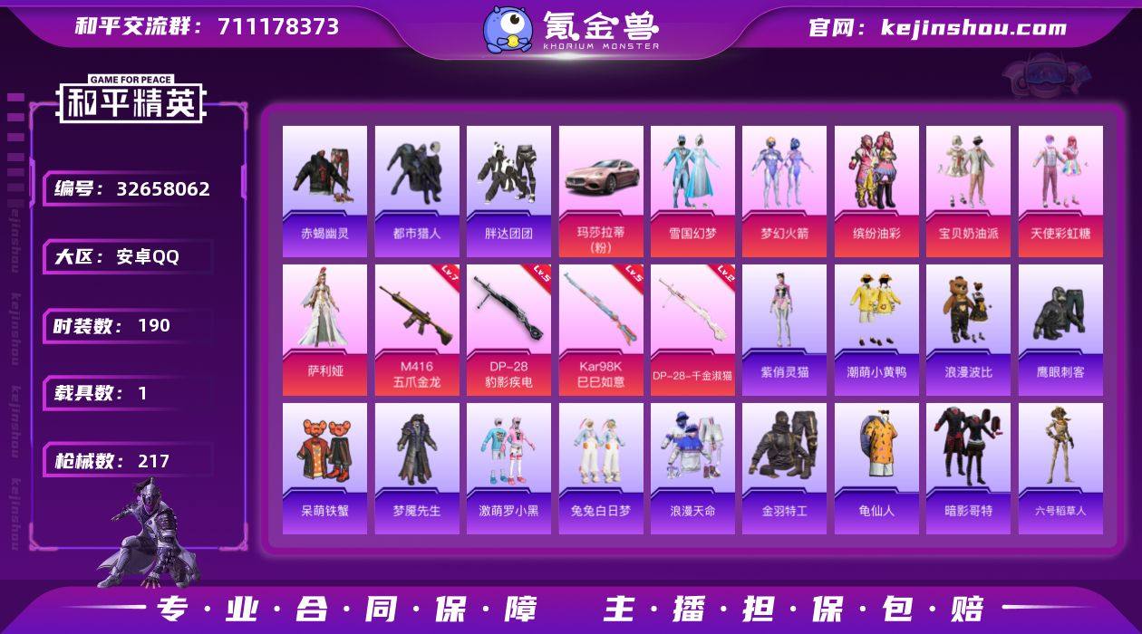 【AZH3328】安卓 手Q【无敌战神框 都市赤蝎雪国猪脸梦幻火箭 满级五爪金龙M416 粉熊背包 1载具】无敌战神框-6粉装-5特效枪-1载具-0粉色飞行器-69051热力值-18王牌印记-190套装-217枪皮 【热门品类】:粉装-雪国幻梦,粉装-梦幻火箭,粉装-缤纷油彩,套装-浪漫天命,套装-赤蝎幽灵,套装-都市猎人,套装-胖达团团,套装-金羽特工,套装-龟仙人,套装-潮萌小黄鸭,套装-暗影哥特,套装-浪漫波比,角色-六号稻草人 【粉色套装】:粉装-宝贝奶油派,粉装-天使彩虹糖,粉装-雪国幻梦,粉装-梦幻火箭,粉装-缤纷油彩,角色-萨利娅 【粉色枪皮等级】:M416-五爪金龙(七级),Kar98K-巳巳如意(五级),Mk14-福马献瑞(五级),DP-28-千金淑猫(二级),DP-28-豹影疾电(五级) 【粉色载具】:玛莎拉蒂Ghibli(粉) 【粉色枪皮】:M416-五爪金龙,Kar98K-巳巳如意,Mk14-福马献瑞,DP-28-千金淑猫,DP-28-豹影疾电 【粉色降落伞】:甜心宝贝降落伞,梦幻火箭降落伞,暗夜玫瑰降落伞,碧影闪光降落伞,垂柳戏鸭降落伞,太空嘟嘟降落伞,精灵梦叶罗丽降落伞,幻彩电音降落伞,虹云熊熊降落伞 【稀有套装】:套装-龟仙人,套装-巳巳如意,套装-雪国风尚,套装-马上有钱,套装-粉恋花,套装-紫幽梦...