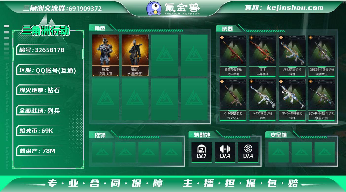 78m总资产-69k哈夫币-60烽火等级-钻石-7战场等级-列兵ws0163 【干员外观】:骇爪-水墨云图,威龙-凌霄戍卫 【近战皮肤】:近战-黑鹰 【传说外观】:AKM突击步枪-锦绣,QBZ95-1突击步枪-凌霄戍卫,QBZ95-1突击步枪-腾驹驰春,K416突击步枪-行动记录,SCAR-H战斗步枪-水墨云图,腾龙突击步枪-马年祥瑞,K437突击步枪-锦绣,SMG-45冲锋枪-锦绣,SMG-45冲锋枪-腾驹驰春,M14射手步枪-蛮荒,G18-马年祥瑞 【史诗外观】:AUG突击步枪-天命,P90冲锋枪-天命,K416突击步枪-腊梅,SCAR-H战斗步枪-囚徒,K437突击步枪-丛影谍踪,SMG-45冲锋枪-阿萨拉特攻,SR-3M紧凑突击步枪-开工大吉,勇士冲锋枪-丛影谍踪,MP7冲锋枪-六套之力,M249轻机枪-丛影谍踪,QJB201轻机枪-炽焰,VSS射手步枪-丛影谍踪 【稀有外观】:AK-12突击步枪-阿萨拉卫队,M700狙击步枪-阿萨拉卫队,PTR-32突击步枪-花岗岩,SR-3M紧凑突击步枪-花岗岩,SV-98狙击步枪-花岗岩*3,AS Val突击步枪-地平线,QCQ171冲锋枪-地平线*3,K416突击步枪-行动开启,SG552突击步枪-马年新春,SG552突击步枪-贴花艺术,AK-12突击步枪-烈焰狂潮, AK-12突击步枪-马年新春,CAR-15突击步枪-来财,KC17突击步枪-来财,MP5冲锋枪-弄臣,SMG...