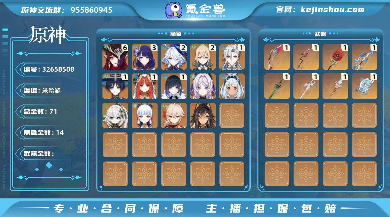 71黄 风元素:6命恰斯卡, 0命枫原万叶, 1命流浪者, 0命温迪 火元素:1命胡桃 水元素:2命芙宁娜, 0命玛拉妮, 1命那维莱特, 1命夜兰, 1命妮露, 0命珊瑚宫心海 雷元素:3命雷电将军, 0命伊涅芙, 0命八重神子 冰元素:0命茜特菈莉, 0命神里绫华, 0命埃洛伊 岩元素:0命钟离 草元素:0命纳西妲 【常驻五星角色及命座】 风元素:2命琴, 0命梦见月瑞希 火元素:0命迪希雅, 5命迪卢克 水元素:3命莫娜 雷元素:3命刻晴 冰元素:4命七七 单手剑:精1磐岩结绿, 精1风鹰剑 双手剑:精1无工之剑 长柄武器:精1天空之脊, 精1护摩之杖, 精1薙草之稻光 法器:精1四风原典, 精1四风原典, 精1天空之卷 弓:精1星鹫赤羽, 精1最初的大魔术, 精1终末嗟叹之诗 【角色皮肤】 五星角色:神里绫华-花时来信 四星角色:班尼特-炽绘奇旅, 丽莎-叶隐芳名, 菲谢尔-极夜真梦, 凝光-纱中幽兰