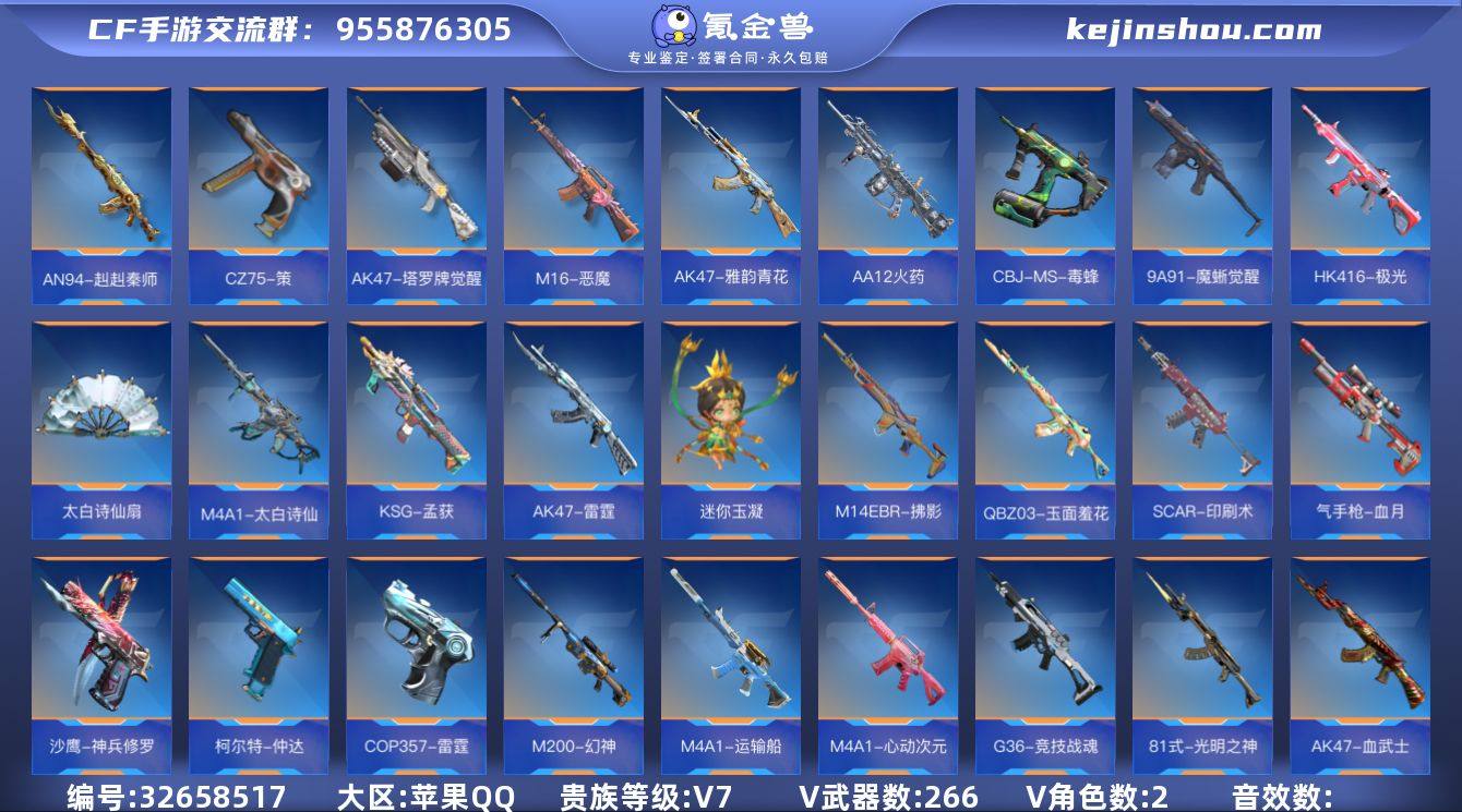 【940132】大师S-2英雄角色数-264英雄武器数 【王者系列】:王者之翼,王者之势,王者之影,王者之光,王者之蝶,王者之狱,王者之霆,M12S-雷霆王者,王者之尊 【热门武器】:KSG-孟获,CZS2-仲康,81式-光明之神,M200-幻神,COP 357-雷霆 【角色】:葵,炽天使-X 【英雄武器】:AK47-火麒麟*2,AK47-沙漠领主,AK47-燎天净火,AK47-血武士,AK47-黑鲨,AK47-木兰*3,AK47-雷霆,AK47-雅韵青花,AK47-塔罗牌觉醒,AK47-谜城烟火,M4A1-雷神*2,M4A1-黑骑士,M4A1-死神,M4A1-机械迷城,M4A1-赛博雷神,M4A1-心动次元*2,M4A1-运输船*2,M4A1-千变,M4A1-太白诗仙,SCAR-幽暗骑士,SCAR-探星者,SCAR-印刷术,SCAR-心动PICK,AN94-赳赳秦师,9A91-天神,9A91-魔蜥觉醒*2,M14EBR-天神,M14EBR-拂影,M14EBR-葫芦山庄,M16-恶魔,QBZ03-金色蔷薇,QBZ03-死神,QBZ03-玉面羞花*2,HK416-极光,HK417-炎龙铠甲,81式-光明之神,G36-竞技战魂,G36-李星云,G3A3-衍神兵,FN F2000-十绝阵觉醒,AK103-湮灭,AWM-天龙,AWM-裁决,AWM-天使,AWM-指南针觉醒,AWM-大湾溢彩,巴雷特-毁灭*5,巴雷特-雷神,巴雷特-金色蔷薇,M200-幻神,M200-心动次元觉醒,09式狙-天神,98K-黑骑士,T...