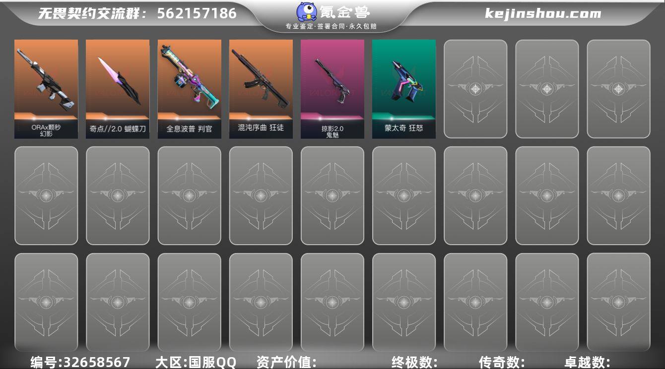 【蝴蝶刀+全T0热门枪皮】精品手慢无系列!【可秒换绑 自带包赔】S194170无畏契约/92等级/青铜段位/23英雄/9皮肤/资产9440/已使用R点305/剩余R点155/混沌序曲-狂徒,ORA-x-颗秒-幻影,奇点//2.0-蝴蝶刀,全息波普-判官,掠影//2.0-鬼魅