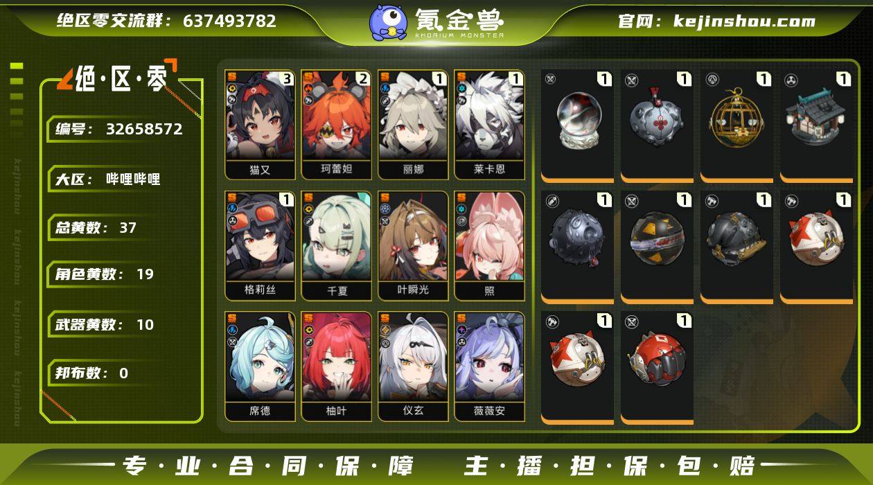 总黄数51,拥有大量高命座核心代理人(10个6命角色、5命真斗、3命猫又等) 多把高精炼邦布与音擎,还有72抽资源、20多抽大保底,邦布200抽。各业绩及未兑换高数 B服未实名账号,安全性高、买家接受度好 多资源未探索,体验感丰富,探索省力 小师姐皮肤等 有兴趣的来,接受搞价