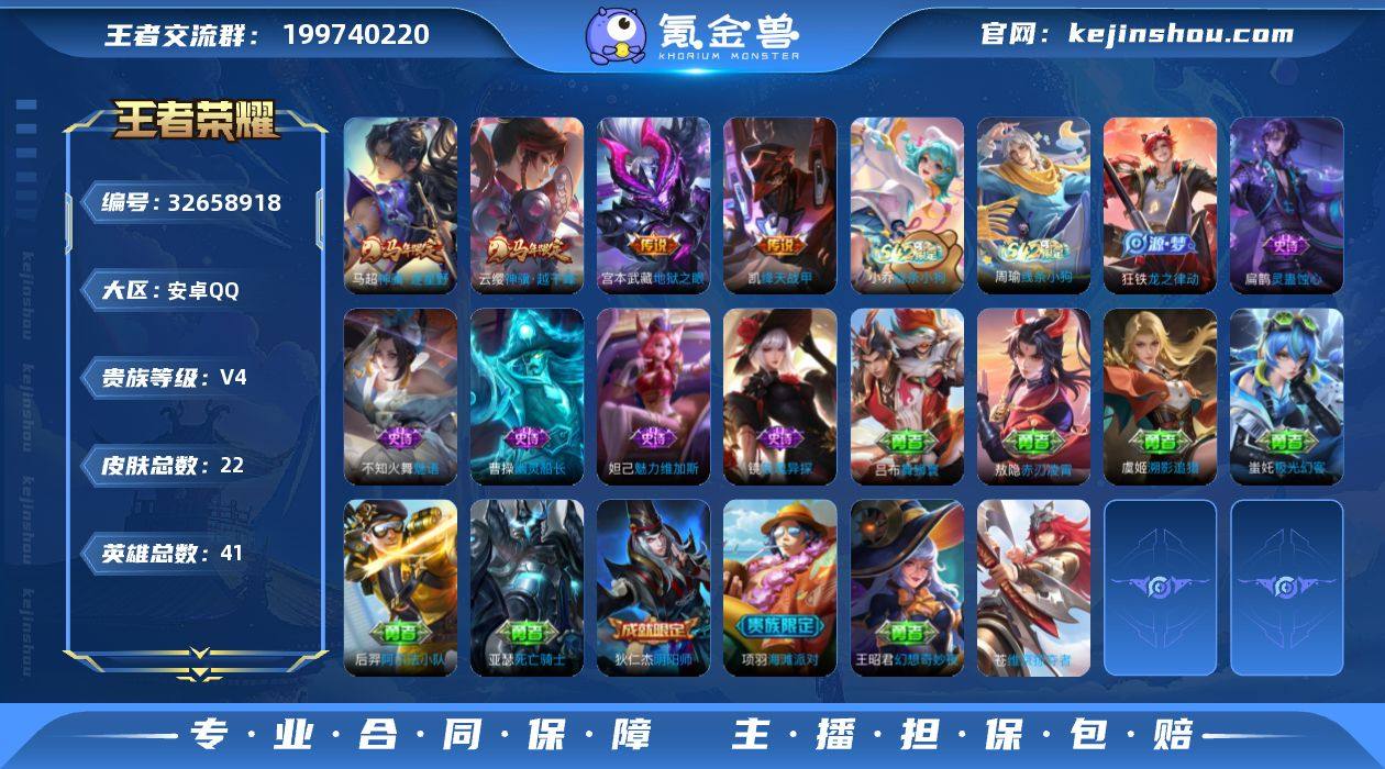 贵族等级: V4 英雄数: 41 皮肤数: 22 传说皮: 绛天战甲,地狱之眼,神骥·越千峰,神骥·逐星野