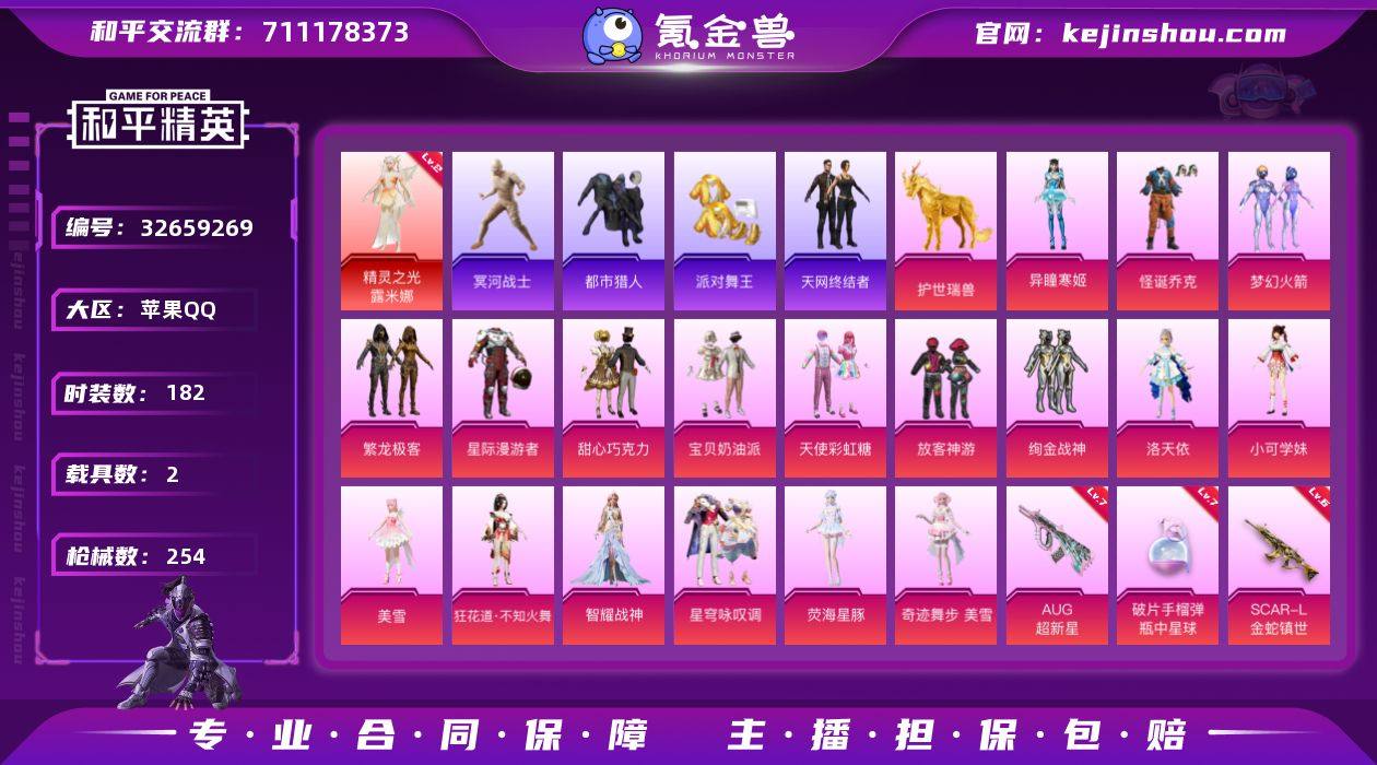 【940149】苹果【红装号 精灵之光-露米娜(二级)/木乃伊/AKM-暮色玫影(三级)/SCAR-L-金蛇镇世(六级)/GROZA-巴啦啦小魔仙(四级)/AUG-超新星(七级)/M416-星际漫游/师父专用外套/粉装-怪诞乔克/粉装-梦幻火箭/套装-都市猎人/套装-派对舞王/套装-天网终结者/护世瑞兽】 手Q-1神装-18粉装-21特效枪-2载具-13粉色飞行器-89754热力值-11王牌印记-182套装-254枪皮 【红色神装等级】:精灵之光-露米娜(二级) 【红色角色神装】:精灵之光-露米娜 【热门品类】:粉装-怪诞乔克,粉装-梦幻火箭,粉装-繁龙极客,套装-都市猎人,套装-冥河战士,套装-派对舞王,套装-天网终结者,套装-暗夜之虎,套装-暗影哥特,角色-Mark.06,角色-六号稻草人,M416-星际漫游,师父专用外套,套装-红熊茄茄 【粉色套装】:粉装-星际漫游者,粉装-怪诞乔克,粉装-甜心巧克力,粉装-宝贝奶油派,粉装-天使彩虹糖,粉装-梦幻火箭,粉装-放客神游,粉装-绚金战神,角色-洛天依,角色-小可学妹,粉装-繁龙极客,角色-美雪,角色-狂花道·不知火舞,角色-智耀战神,粉装-星穹咏叹调,角色-荧海星豚,角色-奇迹舞步 美雪,角色-异瞳寒姬 【粉色枪皮等级】:AKM-暮色玫影(三级),SCAR-L-金蛇镇世(六级),GROZA-巴啦啦...