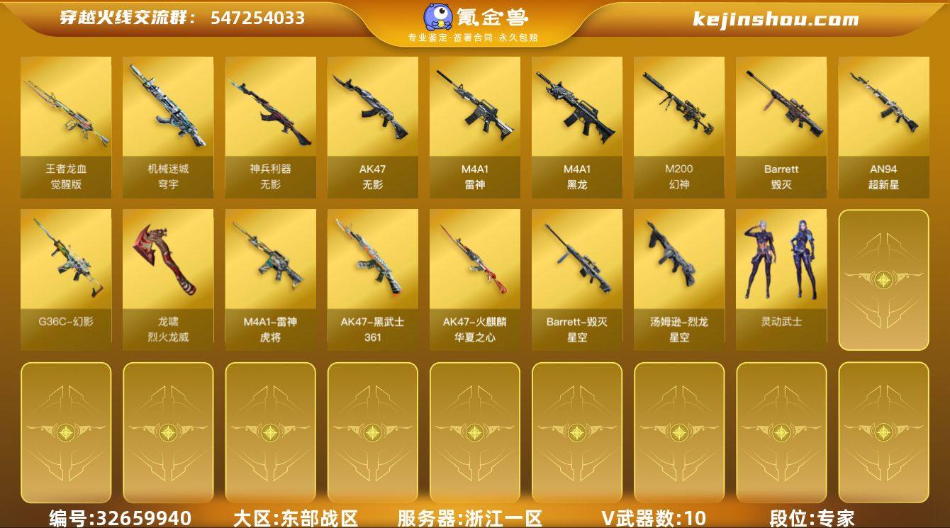 【940163】浙江一区-11V-1王者武器数-0炫金武器数 【热门武器】:G36C-幻影,M200-幻神 【皮肤】:烈龙-星空,雷神-虎将,火麒麟-华夏之心,毁灭-星空,AK47-黑武士-361 【角色】:暗夜-X,嘉年华灵狐,灵动武士,龙儿,麻雀,新娜塔莎 【人偶武器】:白虎-迷你小艾,AWM-灵狐-15周年嘉年华,深渊终结者手雷 【挑战大师】:激光毁灭者III-白马银枪,神圣爆裂者-末日III 【英雄级武器】:M4A1-黑龙,M4A1-雷神,AK47-无影,AN94-超新星,无影-神兵利器,G36C-幻影,王者龙血-觉醒版,机械迷城-穹宇,Barrett-毁灭,M200-幻神,龙啸-烈火龙威 【源级武器】:源·火麒麟,源·雷神,魂·雷神-神秘按键,魂·雷神-新春神龙,魂-雷神-萌杀,魂·雷神-15周年嘉年华,魂·黑骑士-现代金属,灵·黑骑士-破界 I,源·天启,御·超新星-圣诞,魂·HK417-朱雀-凤灵,源·玫瑰精灵,源-极光,源·天龙*2,AWM-裁决-百城联赛天津,魂·裁决-凤灵*2,魂·裁决-羽掣,魂·毁灭-航天科技,源·Barrett-朱雀,魂·修罗-15周年嘉年华,源·天神,灵·天神-穹宇,魂·屠龙-春桃,魂·屠龙-都是Cfer,魂·擎天-破浪10年,源·擎天-萌杀,源·龙啸,魂·麒麟刺-月 【道具】:全能枪王背包,超级背包,绿色巨人,灵魂忍者,迷...