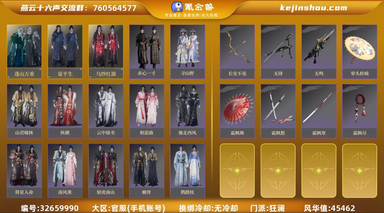 九剑毕业号,造诣顶尖,词条毕业。两颗未用八音窍,4.5万风华值,带八音套装,常用奇术八音特效,八音武学特效,两套不同流派满级心法,125抽绕梁之音,5.4万长鸣玉,家业满级,游戏内各种材料储备充足