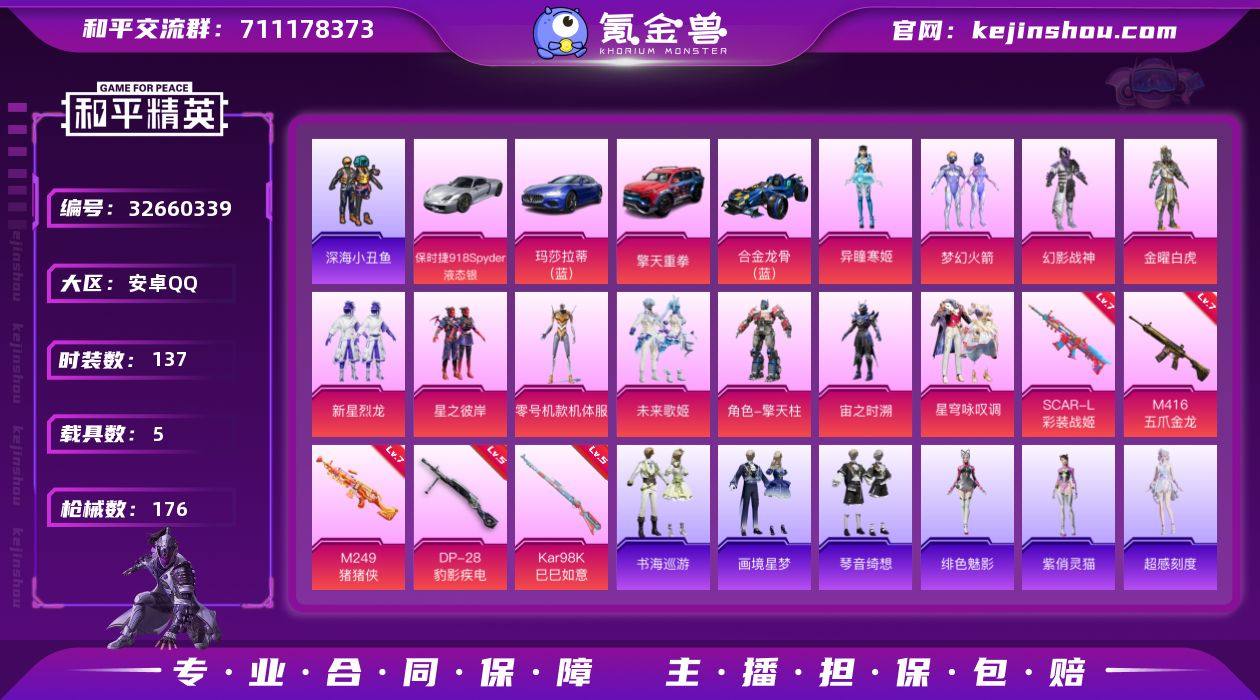 安卓【男神号/粉装-梦幻火箭,角色-Mark.06,粉装-梦幻火箭,SCAR-L-彩装战姬(七级),M416-五爪金龙(七级),角色-零号机款机体服,/玛莎拉蒂Ghibli(蓝),保时捷918 Spyder(液态银),擎天重拳,合金龙骨(蓝),暮色幽蹄】 手Q-11粉装-7特效枪-5载具-5粉色飞行器-64050热力值-3王牌印记-137套装-176枪皮 【热门品类】:粉装-梦幻火箭,套装-深海小丑鱼,角色-Mark.06,撬棍-龙胆亮银枪 【粉色套装】:粉装-幻影战神,粉装-金曜白虎,粉装-梦幻火箭,粉装-新星烈龙,粉装-星之彼岸,角色-零号机款机体服,粉装-未来歌姬,角色-擎天柱,角色-宙之时溯,粉装-星穹咏叹调,角色-异瞳寒姬 【粉色枪皮等级】:SCAR-L-彩装战姬(七级),M416-五爪金龙(七级),AKS-74U-森灵之息(五级),Kar98K-巳巳如意(五级),M249-猪猪侠(七级),DP-28-豹影疾电(五级),燃烧瓶-薄荷可可(五级) 【粉色载具】:玛莎拉蒂Ghibli(蓝),保时捷918 Spyder(液态银),擎天重拳,合金龙骨(蓝),暮色幽蹄 【粉色枪皮】:SCAR-L-彩装战姬,M416-五爪金龙,AKS-74U-森灵之息,Kar98K-巳巳如意,M249-猪猪侠,DP-28-豹影疾电,燃烧瓶-薄荷可可 【粉色飞行器】:炫彩糖果飞行器,梦幻火箭飞行器,变形金刚飞...