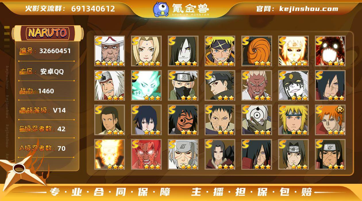 【微氪1.2w 性价比多忍者】y7177 战力1460w 42s 70a 熊猫 3个328a 2个298a 16个198a 1800金币 25忍法帖可开 狂野鲛鲨 武士再不斩+侠隐纲手时装 五星纲手 四星大蛇丸 纲手 71片秽土日斩 34片十尾带土 46片小胡子 37片大野木