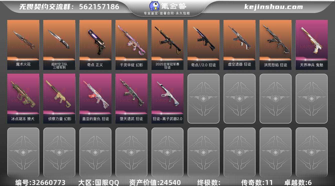 【自带包赔 可赔三倍】:库存价值 24540当前铂金 三棱+电光钳 多T0狂徒性价比热门库存号 【限定】: 2025全球冠军赛 狂徒 【近战】: 超时空卫队 三棱军刺, 魔术火花 【狂徒】: 洪荒怒焰 狂徒, 盖亚的复仇 狂徒, 2025全球冠军赛 狂徒, 离子武器//2.0 狂徒, 虚空遗器 狂徒, 堕天遗武 狂徒, 奇点//2.0 狂徒 【幻影】: 侦察力量 幻影, 千灵华绽 幻影 【正义】: 奇点 正义 【獠犬】: 冰点凝冻 獠犬 【鬼魅】: 天界神兵 鬼魅 【概要】: 总皮肤 54 终极0 传奇11 卓越6 刀皮2 英雄 28 LV144 历史最高:铂金 当前段位:铂金 已使用 770 R点 剩余 5R点 不可二次 卡面、挂饰、其他皮肤请看截图 道具、段位等以实际验号为准。如账号因没有维护,赛季更新等不可抗因素发生变化,不属于账号质量问题"