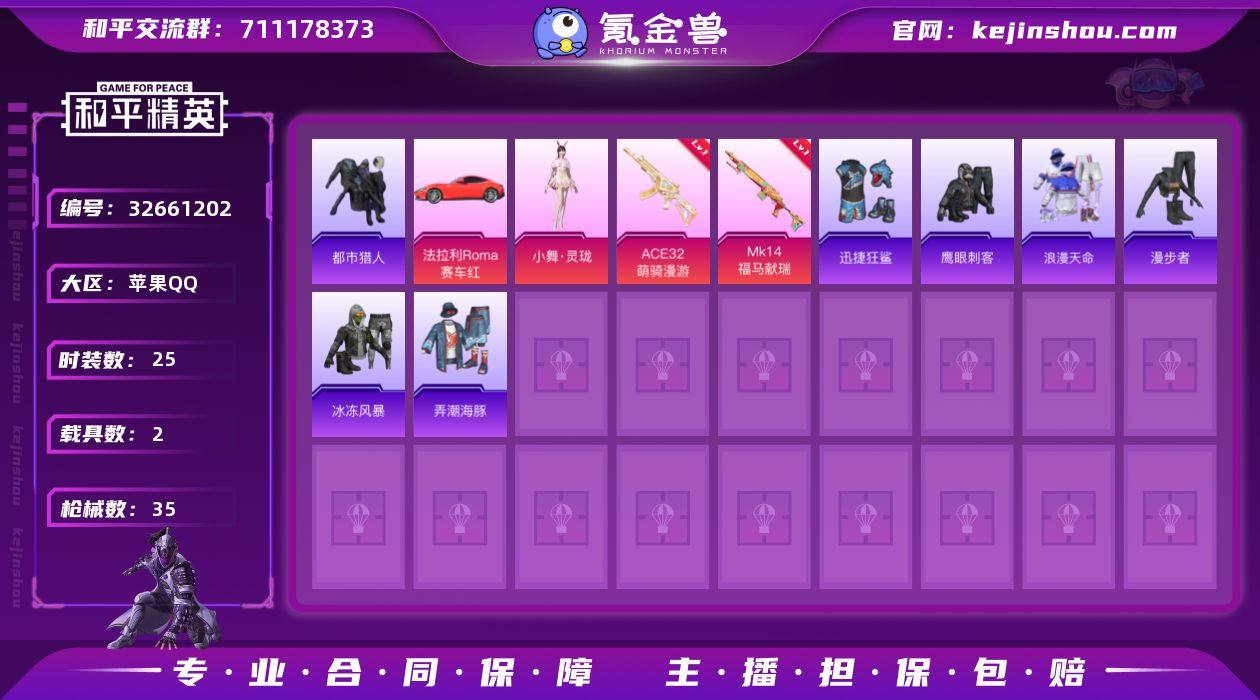 M1047198【素材号2载具-1粉装-2特效枪浪漫天命,都市猎人AWM-黄金龙骨,M416-黄金龙骨】苹果手Q-2载具-1粉装-2特效枪-25套装-35枪皮-1王牌印记-超级王牌10星-11090热力值【2载具】法拉利Roma(赛车红),霜月冰狼【1粉装】人物-小舞·灵珑【2特效枪】Mk14-福马献瑞[4级],ACE32-萌骑漫游[4级]【4稀有】浪漫天命,都市猎人,AWM-黄金龙骨,M416-黄金龙骨【2飞行器】冰狼掠影飞行器,云朵驼驼飞行器【3头盔】金羽特工头盔,深海小丑鱼头盔,幻影战神头盔【1背包】金羽特工背包【53其它衣服和枪皮】迅捷狂鲨,SS37特训,冰冻风暴,夏日倾情,角色-奈斯,红釉青花,雨过天青,角色-魂电,街头潮人,角色-X,角色-幸运青,角色-绯影武装,鹰眼刺客,魅力单车,角色-阿虎,弄潮海豚,黄色名流,缤纷果语,漫步者,迅捷龙虾,福马献瑞,狙击之神,AKM-影袭,PKM-雨过天青,MG3-幻世战舞者,VSS-星之彼岸,GROZA-福马献瑞,M16A4-雨过天青,AMR-雨过天青,20-H-绶带小兔,M24-影袭,GROZA-影袭,汤姆逊-像素花束,AKM-龙的传人,M24-天降萌叽,UZI-影袭,P90-霜月狼主,SVD-绯影武装,F57-绯影武装,大砍刀-像素花束,大砍刀-霜月狼主,Kar98K-影袭,DP-28-彩虹符号,AA12-G-雨过天青,汤姆逊-天降萌叽,烟雾弹-小舞,SCAR-L-绶带小兔,Famas-霜月狼...
