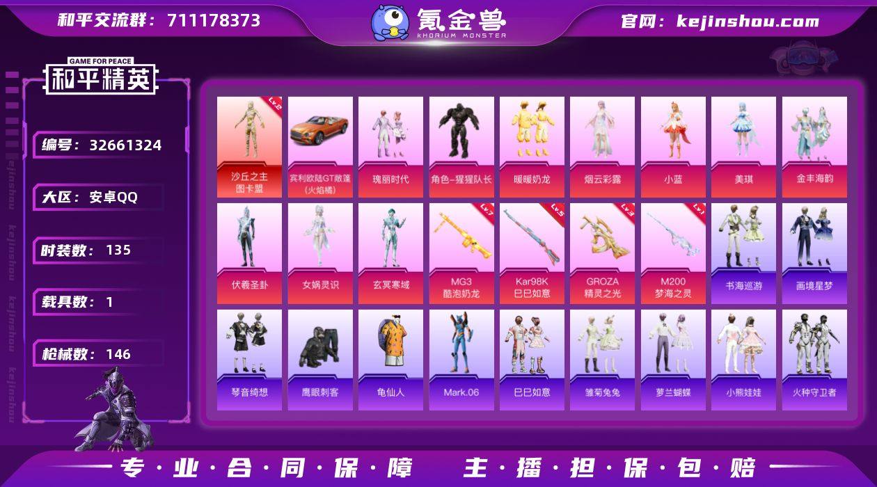 安卓【极品神装号 沙丘之主-图卡盟(二级),角色-Mark.06,GROZA-精灵之光(三级),ACE32-萌骑漫游(三级),宾利欧陆GT敞篷(火焰橘)】 手Q-1神装-10粉装-6特效枪-1载具-4粉色飞行器-55077热力值-11王牌印记-135套装-146枪皮 【红色神装等级】:沙丘之主-图卡盟(二级) 【红色角色神装】:沙丘之主-图卡盟 【热门品类】:套装-龟仙人,角色-Mark.06 【粉色套装】:粉装-瑰丽时代,角色-猩猩队长,粉装-暖暖奶龙,角色-烟云彩露,角色-小蓝,角色-美琪,粉装-金丰海韵,角色-伏羲圣卦,角色-女娲灵识,角色-玄冥寒域 【粉色枪皮等级】:GROZA-精灵之光(三级),ACE32-萌骑漫游(三级),Kar98K-巳巳如意(五级),Mk14-福马献瑞(四级),M200-梦海之灵(一级),MG3-酷泡奶龙(七级) 【粉色载具】:宾利欧陆GT敞篷(火焰橘) 【粉色枪皮】:GROZA-精灵之光,ACE32-萌骑漫游,Kar98K-巳巳如意,Mk14-福马献瑞,M200-梦海之灵,MG3-酷泡奶龙 【粉色飞行器】:香车宝马飞行器,沙丘之主天马,幻海精灵飞行器,曦光华影飞行器 【粉色降落伞】:恐龙拽拽降落伞,梦幻舞会降落伞,变形金刚降落伞,超新星降落伞,沙丘之主降落伞,精灵梦叶罗丽降落伞,创世·救赎降落伞,精灵之光降落伞,千金淑猫...
