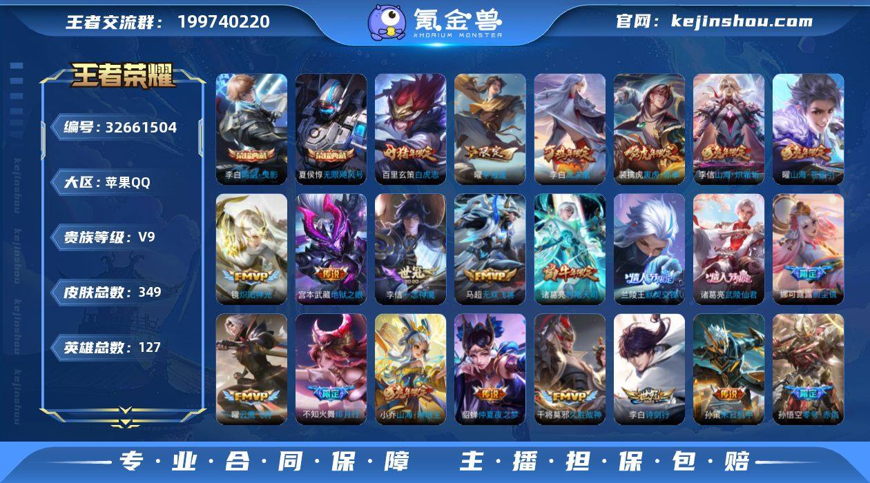 苹果Q-V9-至尊星耀II段位-127英雄-349皮肤-2典藏皮肤-29传说-106史诗【英雄全皮】:孙权全皮,娜可露露全皮,李信全皮【荣耀典藏】:夏侯惇无限飓风号,李白鸣剑曳影【传说皮肤】:小乔山海琳琅生,曜山海苍雷引,李信山海炽霜斩,李白诗剑行,不知火舞绯月行,娜可露露前尘镜,马超无双飞将,孙策挚爱之约,孙策末日机甲,裴擒虎寅虎赤拳,孙尚香异界灵契,曜李逍遥 ,周瑜音你心动,兰陵王默契交锋,诸葛亮时雨天司,铠绛天战甲,镜炽阳神光,虞姬启明星使,孙悟空零号赤焰,曜云鹰飞将,李信一念神魔,干将莫邪久胜战神,百里玄策白虎志,花木兰冠军飞将,梦奇胖达荣荣,诸葛亮武陵仙君,貂蝉仲夏夜之梦,李白凤求凰,宫本武藏地狱之眼【限定皮肤】:杨戬破阵退雄兵,狄仁杰阴阳师,小乔山海琳琅生,赵云皇家上将,墨子神迹守卫,嬴政优雅恋人,孙尚香蔷薇恋人,孙尚香异界灵契,庄周高山流水,阿轲迷踪丽影,钟无艳超时空战士,孙膑天狼运算者,扁鹊奇幻香踪,白起夜都怪侠,芈月幻夜卜梦,吕布御风骁将,元歌云间偶戏,元歌无心,甄姬游园惊梦,甄姬落雪兰心,马可波罗山海玄木吟,狄仁杰魔术师,狄仁杰万华元夜,达摩星际陆战队,达摩沙漠行僧,项羽海滩派对,项羽霸王...