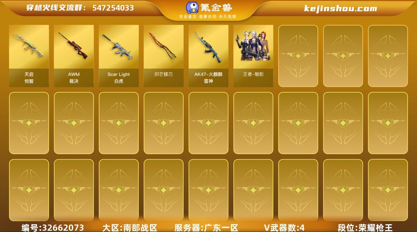 广东一区-6V-2王者武器数-0炫金武器数 【热门武器】:Scar Light-白虎,炽芒蝶刃 【王者炫金武器】:天启-悦智 【皮肤】:裁决-星际旅行 皮肤,火麒麟-雷神,轻型军用手斧-再燃火线 【角色】:王者-魅影,乔伊教练,芳心审判者,0号玩家,灵狐-花神,灵狐者-职业经理,潘多拉-甜心教官,兔囡囡,团团 【英雄级武器】:Scar Light-白虎,AWM-裁决,炽芒蝶刃,闪光弹-雷暴王者,AK47-竞魂无影 【源级武器】:源·火麒麟,火麒麟-雷神,源·雷神,魂·M4A1-雷神-化蛇,魂·雷神-神秘按键,魂·雷神-新春神龙,御·雷神-烈虎,魂·黑骑士-破浪10年,源·武圣*2,源-金色蔷薇,金色蔷薇-狼王,魂·玫瑰精灵-傲梅,Barrett-极光-掌火,源·天龙,魂·天龙-彼岸花,魂·裁决-凤灵,魂·裁决-羽掣,源·毁灭,御·毁灭-黑大圣,灵·Barrett-金色蔷薇-甜蜜火力,魂·Barrett-朱雀-锦鲤,灵·Barrett-朱雀-炫光,魂·修罗-迷彩,魂·修罗-现代金属,源·武圣glock*2,魂·屠龙-惊鸿,源·擎天-萌杀 【道具】:云山科技背包,女皇终结者-魔龙之吻,绿色巨人,灵魂忍者,迷雾幽灵,夺命之镰,防化服*3,流光-鎏金之域,枪王排位29赛季金色流光,防弹头盔*3,防弹衣*3,C4工具钳*3,手雷包*3 【特殊枪械】:1白虎