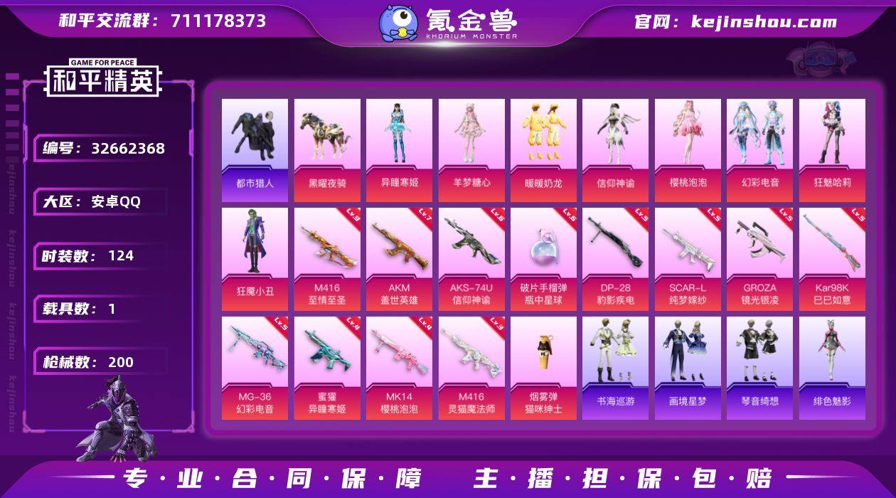【940189】安卓 手Q-8粉装-16特效枪-1载具-6粉色飞行器-70074热力值-9王牌印记-124套装-200枪皮 【热门品类】:套装-都市猎人,套装-龟仙人,套装-粉红小猪,角色-8号机,角色-Mark.06,套装-红熊茄茄 【粉色套装】:粉装-暖暖奶龙,角色-信仰神谕,角色-樱桃泡泡,粉装-幻彩电音,角色-狂魅哈莉,角色-狂魇小丑,角色-羊梦糖心,角色-异瞳寒姬 【粉色枪皮等级】:AKM-盖世英雄(七级),SCAR-L-纯梦嫁纱(五级),M416-至情至圣(九级),M416-灵猫魔法师(三级),GROZA-镜光银凌(五级),蜜獾-异瞳寒姬(四级),ACE32-萌骑漫游(五级),AKS-74U-信仰神谕(六级),AKS-74U-森灵之息(二级),Kar98K-巳巳如意(五级),Mk14-樱桃泡泡(四级),Mk14-福马献瑞(五级),DP-28-豹影疾电(五级),MG-36-幻彩电音(五级),破片手榴弹-瓶中星球(六级) 【粉色载具】:黑曜夜骑 【粉色枪皮】:AKM-盖世英雄,SCAR-L-纯梦嫁纱,M416-至情至圣,M416-灵猫魔法师,GROZA-镜光银凌,蜜獾-异瞳寒姬,ACE32-萌骑漫游,AKS-74U-信仰神谕,AKS-74U-森灵之息,Kar98K-巳巳如意,Mk14-樱桃泡泡,Mk14-福马献瑞,DP-28-豹影疾电,MG-36-幻彩电音,烟雾弹-猫咪绅士,破片手榴弹-瓶中星球 【粉色飞行器】:炫彩糖果飞行...