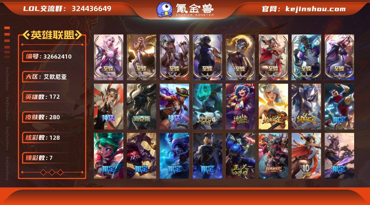 【940186】钻石段位-172英雄-280皮肤-128炫彩-0终极-14神话-45限定-29传说-58史诗 【珍稀头像】:星守阿狸头像 【神话皮肤】:十周年纪念安妮,源代码乐芙兰,殿堂传奇乐芙兰,十五周年纪念希维尔,沉溺暗影卢锡安 【至臻皮肤】:至臻魅惑女巫厄运小姐,至臻绝息圣堂厄运小姐,至臻焰执事布兰德,至臻灵魂莲华拉克丝,至臻KDA卡莎,至臻真实伤害赛娜,至臻星之守护者艾克,至臻神凰行者烈羽焰凰霞 【海克斯皮肤】:零之枪骑赫卡里姆 【臻彩皮肤】:无畏骑士瑟庄妮赤子初心,冠军掠夺者卡兹克凯旋圣装,神龙尊者圣龙李青龙腾云起,可爱可爱粉红红布里茨,殿堂传奇乐芙兰登神,魔女阿卡丽虚荣,净雪之月莫甘娜冬虹 【年限皮肤】:春晖神女拉克丝,王国机神苍狼瑟提 【冰雪限定】:幸福女神乐芙兰,平安夜女神娑娜,喜庆之树茂凯,圣诞玩偶波比,冰雪驯鹿波比,圣诞驯鹿克格莫,冰雪节辛吉德,冰雪节格雷福斯 【限定皮肤】:冠军典狱长锤石,冠军之血希瓦娜,暗杀星奥莉安娜,暗杀星慎,SKTT1贾克斯,SKTT1劫,SSW图奇,SSW锤石,SKTT1阿兹尔,SKTT1卡莉丝塔,SKTT1雷克顿,SKTT1瑞兹,SKTT1烬,SKTT1辛德拉,iG卡莎,DWG奈德丽,EDG格雷福斯,EDG佛耶戈,神凰行者烈羽焰凰霞,胜...