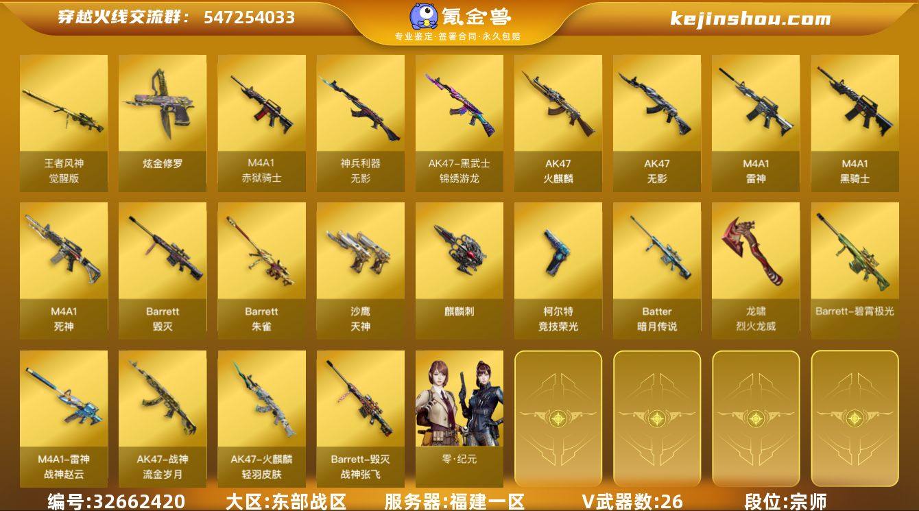 福建一区-27V-2王者武器数-2炫金武器数 【热门武器】:Cat-刀锋,M4A1-黑骑士 【王者炫金武器】:王者冰锋,炫金修罗*2 【音效卡】:AK47-火麒麟音效卡,M4A1-雷神音效卡,Barrett-毁灭音效卡,Barrett-碧霄极光音效卡 【皮肤】:雷神-冠军之魄,M4A1-战神赵云,火麒麟-轻羽皮肤,毁灭-战神张飞,毁灭-英雄计划 皮肤,战神-流金岁月皮肤 【角色】:零·纪元,乔伊教练,修道士,电竞少女,风暴女,虎妞,嘉年华灵狐,龙儿,斯沃特-X,兔囡囡 【人偶武器】:AWM-灵狐-15周年嘉年华,Cat-刀锋,生化手雷-机甲核心,闪光弹-小乔 【挑战大师】:神圣爆裂者-末日III 【英雄级武器】:AK47-火麒麟,M4A1-雷神*2,M4A1-黑骑士,AK47-无影,M4A1-死神,无影-神兵利器,黑武士-锦绣游龙,Barrett-毁灭,Barrett-朱雀,王者风神-觉醒版,Barrett-暗月传说,沙鹰-天神,柯尔特-竞技荣光,麒麟刺,龙啸-烈火龙威,高爆手雷-竞技荣光*3,闪光弹-竞技荣光,闪光弹-玄豹*2,烟雾弹-竞技荣光*2,烟雾弹-玄豹*2,M4A1-赤狱骑士,Barrett-碧霄极光 【源级武器】:源·火麒麟*6,源-黑龙,御·黑龙-龙太子*2,源·雷神*4,魂·M4A1-雷神-化蛇,魂·雷神-神秘按键,魂·雷神-新春神龙,魂-雷神-萌杀,魂·...
