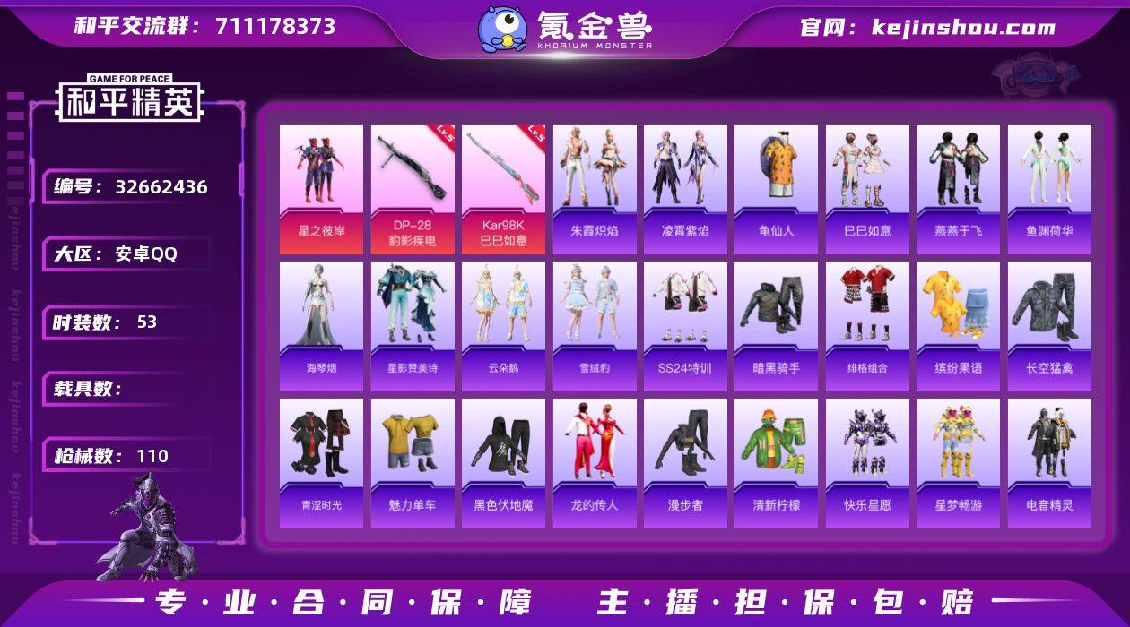 【AZH3338】安卓 手Q【星之彼岸】1粉装-4特效枪-0载具-2粉色飞行器-30038热力值-2王牌印记-53套装-110枪皮 【热门品类】:套装-龟仙人 【粉色套装】:粉装-星之彼岸 【粉色枪皮等级】:Kar98K-巳巳如意(五级),Mk14-福马献瑞(五级),AA12-G-萌骑幻想(五级),DP-28-豹影疾电(五级) 【粉色枪皮】:Kar98K-巳巳如意,Mk14-福马献瑞,AA12-G-萌骑幻想,DP-28-豹影疾电 【粉色飞行器】:炫彩糖果飞行器,极意拳锋飞行器 【粉色降落伞】:梦幻火箭降落伞,洛神天依降落伞,拂晓神骑降落伞,喜羊羊与灰太狼降落伞,炫彩糖果降落伞 【稀有套装】:套装-龟仙人,套装-巳巳如意,套装-雪国风尚,套装-炫彩糖果,套装-马上来财,套装-燕燕于飞,套装-鱼渊荷华,角色-海琴烟,套装-星影赞美诗,套装-云朵鹅,套装-雪绒豹,套装-朱霞炽焰,套装-凌霄紫焰 【稀有枪皮】:AKM-龙的传人,SCAR-L-玉兔迎春,SCAR-L-红色方程式,M416-糯团青竹,M416-蓝色火焰,AUG-耀粉歌者,AUG-青春冒险家,M762-云朵鹅,Mk47-炫光之旅,ARX-凌霄紫焰,UZI-影袭,Vector-彩虹符号,汤姆逊-天降萌叽,汤姆逊-像素花束,野牛-天星战神,JS9-凌霄紫焰,P90-巳巳如意,Kar98K-2B战斗服款,Kar98K-梦幻火箭,VSS-星...