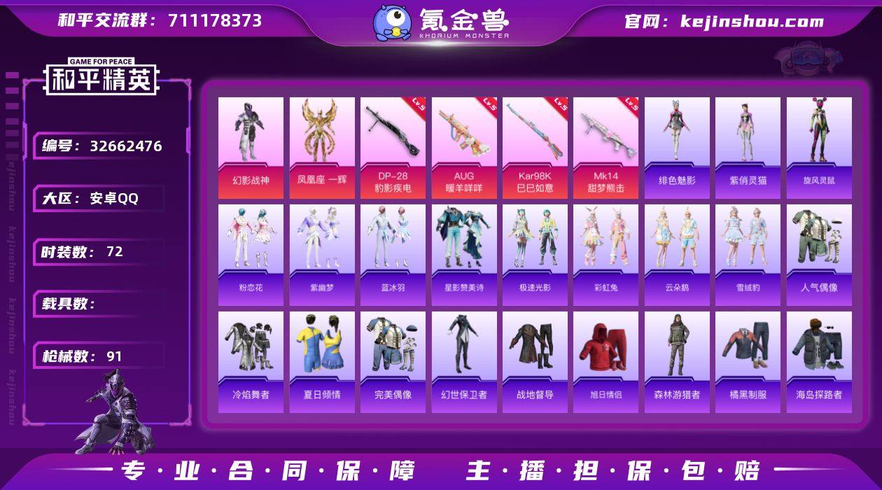 满级地铁安卓 手Q-2粉装-5特效枪-0载具-1粉色飞行器-22951热力值-4王牌印记-72套装-91枪皮 【粉色套装】:粉装-幻影战神,角色-凤凰座 一辉 【粉色枪皮等级】:AUG-暖羊咩咩(五级),Kar98K-巳巳如意(五级),Mk14-甜梦熊击(五级),Mk14-福马献瑞(三级),DP-28-豹影疾电(五级) 【粉色枪皮】:AUG-暖羊咩咩,Kar98K-巳巳如意,Mk14-甜梦熊击,Mk14-福马献瑞,DP-28-豹影疾电 【粉色飞行器】:炫彩糖果飞行器 【粉色降落伞】:鬼刀降落伞,星穹咏叹调降落伞,幻彩电音降落伞,荧海星豚降落伞,异瞳寒姬降落伞,炫彩糖果降落伞 【稀有套装】:套装-炫彩糖果,套装-马上有钱,套装-旋风灵鼠,套装-粉恋花,套装-紫幽梦,套装-蓝冰羽,套装-星影赞美诗,套装-极速光影,套装-彩虹兔,套装-云朵鹅,套装-雪绒豹,角色-绯色魅影,角色-紫俏灵猫 【稀有枪皮】:AKM-龙的传人,SCAR-L-夜灯,SCAR-L-炫彩节奏,SCAR-L-玉兔迎春,M416-红色方程式,M416-蓝色火焰,AUG-耀粉歌者,M762-天降萌叽,M762-云朵鹅,G36C-星穹咏叹调,AC-VAL-天降萌叽,UZI-天降萌叽,UMP45-夜灯,UMP45-生命誓言,UMP45-绒宝小鹅,汤姆逊-像素花束,P90-巳巳如意,Kar98K-影袭,M24-幻彩电音,AMR-喜羊羊与灰太狼...