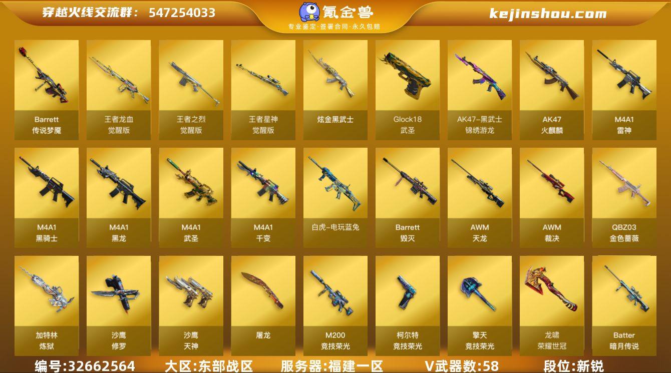 福建一区-63V-3王者武器数-1炫金武器数 【传说武器】:传说梦魇 【热门武器】:传说梦魇,QBZ03-金色蔷薇,M200-竞技荣光,荣耀世冠-火麒麟,白虎-电玩蓝兔,M4A1-黑骑士,加特林-炼狱,裁决-雪莉杨,沙鹰-修罗*2,荣耀世冠-龙啸 【王者炫金武器】:炫金武士 【音效卡】:M4A1-黑骑士音效卡 【皮肤】:雷神-暗月,毁灭-风暴,M4A1-千变-孔明皮肤,黑骑士-战神马超,黑骑士-伏羲,战神-粉色甜心皮肤,战神-紫绶金章皮肤,AK47-B-常胜将军-曹操*2,AWM-天龙-传奇70KG,AWM-天龙-传奇白鲨 【角色】:葵,电竞教官-云悠悠,乔伊教练,修道士,初恋灵狐,电竞少女,飞虎队-X,虎妞,嘉年华灵狐,麻雀,曼陀罗-X,蜀雪,兔囡囡,新娜塔莎,雪莉杨,游珑儿 【人偶武器】:裁决-雪莉杨,AWM-灵狐-15周年嘉年华,海滩汪汪-巴雷特,COP-旗袍,迷你波特博士,深渊终结者手雷,迷你超能女侍,灵狐娃娃手雷 【挑战大师】:冰龙粉碎者-白马银枪,VEPR-12-金魔,神圣爆裂者-末日III 【英雄级武器】:M4A1-千变,AK47-火麒麟,M4A1-黑龙,M4A1-雷神,M4A1-黑骑士,M4A1-武圣*2,黑武士-锦绣游龙,QBZ03-金色蔷薇,烈火-动感闪耀,王者之烈-觉醒版,王者龙血-觉醒版,白虎-电玩蓝兔,荣耀世冠-...