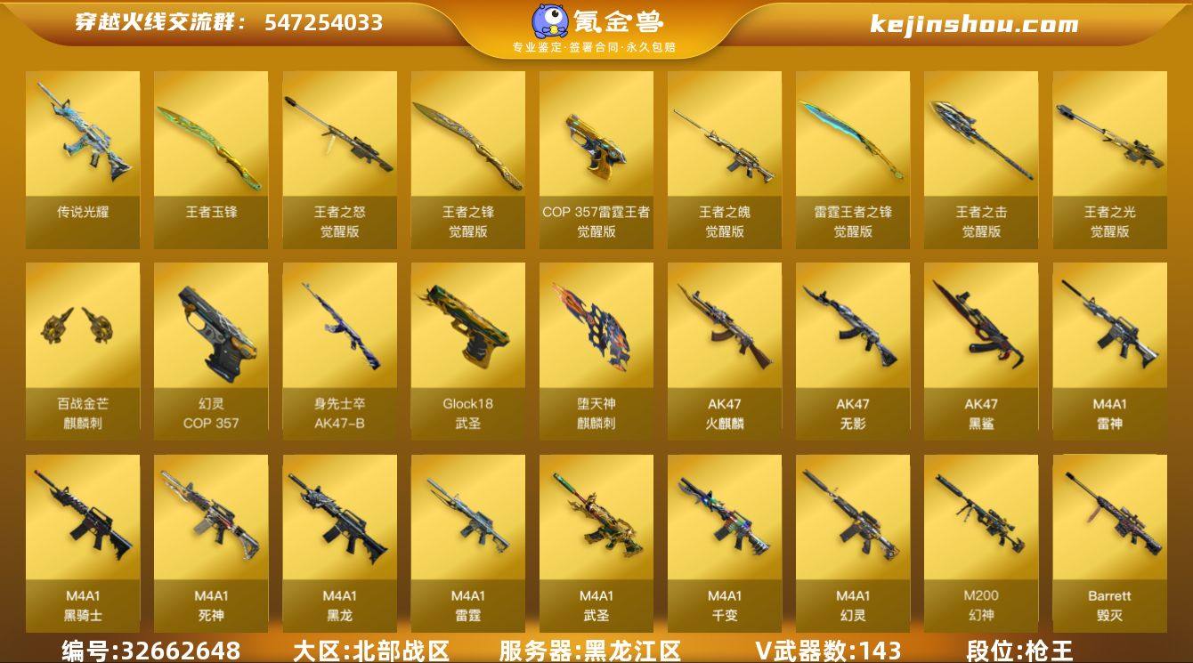 黑龙江区-162V-17王者武器数-0炫金武器数 【传说武器】:传说光耀 【热门武器】:传说光耀,QBZ03-金色蔷薇,M200-幻神,死亡之眼,荣耀世冠-柯尔特,M4A1-黑骑士,汤姆逊-烈龙*6,RPK-盘龙,加特林-炼狱,斯泰尔-蝴蝶,羊驼玩偶,雷神-小红,COP-白鲨,USP-雷暴,COP 357-幻灵*2,沙鹰-修罗*5,黄金猫猫手套-白鲨 【王者炫金武器】:王者玉锋,高爆手雷-雷霆王者*3 【音效卡】:M200-幻神音效卡,AK47-火麒麟音效卡,M4A1-雷神音效卡,M4A1-黑龙音效卡,M4A1-黑骑士音效卡,Barrett-毁灭音效卡,N9语音包,炼狱-百战金芒-庆典舞曲音效卡 【皮肤】:幻神-周瑜皮肤,雷神-暗月,雷神-能量核心,雷神-星空,雷神-R.LGD-CFPLS18冠军,雷神-烈虎皮肤,雷神-宇航兔皮肤,火麒麟-平天大圣*2,毁灭-暗月*2,毁灭-星空,毁灭-冠军之怒,毁灭-风暴*2,毁灭-英雄计划 皮肤,黑龙-能量核心,M4A1-黑龙-361*2,黑骑士-暗月,黑骑士-AG-S4冠军典藏,无影-能量核心,战神-粉色甜心皮肤,战神-紫绶金章皮肤,战神-流金岁月皮肤*3,AK47-B-常胜将军-刘备*2,AK47-B-常胜将军-孙权*2,天龙-秘银,AWM-天龙-传奇70KG,AWM-天龙-传奇白鲨,修罗-能量核心*2 【角色】:葵,炫,影豹,智,王者-葵-...