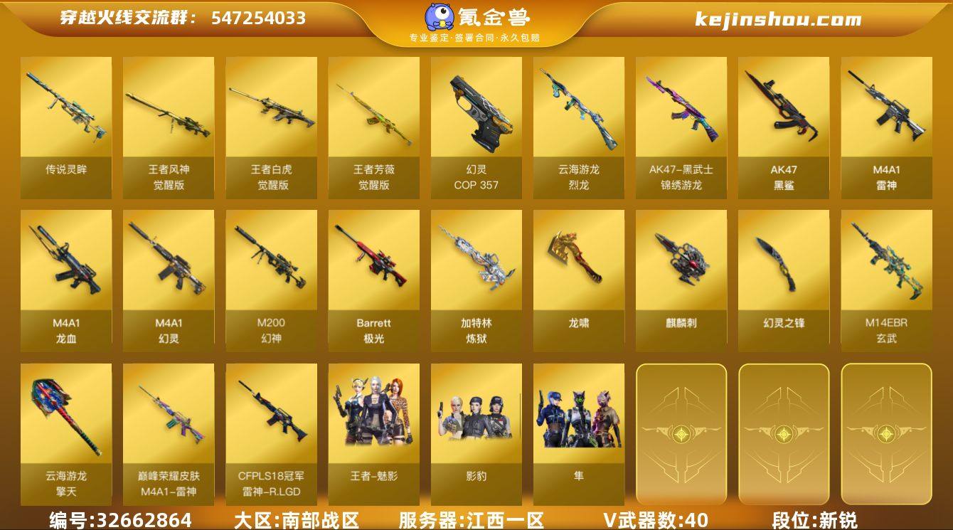 江西一区-46V-3王者武器数-0炫金武器数 【传说武器】:传说灵眸 【热门武器】:传说灵眸,M14EBR-玄武,M4A1-青龙,M200-幻神*2,加特林-炼狱*3,毁灭-孙三炮,COP 357-幻灵 【音效卡】:加特林-炼狱音效卡 【皮肤】:幻神-冠军之幻,雷神-R.LGD-CFPLS18冠军,M4A1-雷神-巅峰荣耀皮肤 【角色】:影豹,隼,王者-魅影,云海玲珑,初恋灵狐,娟娟,兔囡囡 【人偶武器】:毁灭-孙三炮,白虎-迷你小艾,COP-旗袍*2,迷你牛牛,生化手雷-机甲核心,迷你深渊冰龙-王绿豆 【暴走生化】:超级对讲机 【英雄级武器】:M4A1-雷神,AK47-黑鲨,M4A1-龙血,M4A1-青龙,M4A1-幻灵,M14EBR-玄武,黑武士-锦绣游龙,王者白虎-觉醒版,王者芳薇-觉醒版,Barrett-极光,M200-幻神*2,王者风神-觉醒版,加特林-炼狱*3,烈龙-云海游龙,COP 357-幻灵,龙啸*2,麒麟刺,幻灵之锋*3,擎天-云海游龙,高爆手雷-幻灵*5,手雷-云海游龙,闪光弹-幻灵*6,烟雾弹-幻灵*5 【源级武器】:源·火麒麟*3,御·黑龙-龙太子*2,源·雷神*2,魂·雷神-神秘按键,魂·雷神-新春神龙,魂-雷神-萌杀,御·雷神-机甲刑天,魂·黑骑士-幻能朋克,魂·黑骑士-娜塔莉娅,御·黑骑士-冰魄,御·黑骑士·哪吒闹海,灵·黑骑士-破界 I...