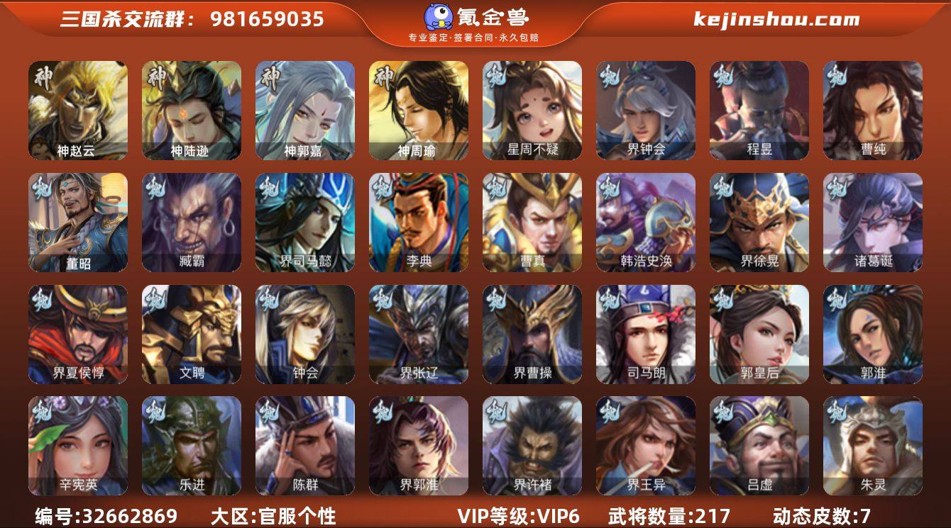 【4188】官阶:领军将军;VIP等级:VIP6;史诗武将数量:11;动态皮肤数量:7;武将总数:217;史诗宝珠数量:9;将魂数量:1703;神将:3;魏国史诗武将:2;蜀国史诗武将:1;吴国史诗武将:0;群史诗武将:3 神赵云,神陆逊,神郭嘉,星周不疑,界钟会,曹纯,程昱,沙摩柯,裴秀,张让,审配,神周瑜,SP关羽,乐进,曹昂,诸葛诞,朱灵,文聘,SP姜维,钟会,曹冲,郭淮,满宠,界王异,界曹操,界司马懿,界夏侯惇,界张辽,界许褚,李典,曹真,韩浩史涣,陈群,曹叡,钟繇,司马朗,郭皇后,辛宪英,吕虔,鲁芝,界徐晃,张恭,界满宠,界郭淮,卞夫人,蔡贞姬,崔琰,臧霸,董昭,势庞羲,SP孙尚香,关银屏,夏侯霸,马良,关兴张苞,廖化,界马岱,关平,简雍,刘封,界法正,界关兴张苞,界刘备,界关羽,界张飞,界马超,SP徐庶,吴懿,周仓,张松,夏侯氏,糜竺,马忠,严颜,界伊籍,界庞统,界孟获,张翼,傅肜,许靖,谋庞统,谋张飞,霍峻,诸葛果,糜芳傅士仁,甘夫人,势陈祗,凌操,诸葛瑾,孙鲁育,程普,韩当,潘璋马忠,虞翻,朱然,界甘宁,界黄盖,界周瑜,界大乔,界陆逊,孙鲁班,朱桓,顾雍,界孙权,界孙尚香,潘濬,孙亮,吕岱,卫温诸葛直,蒋钦,界顾雍,谋周瑜,界孙休,界朱治,界朱桓,伏完,界袁术,SP赵云,伏皇后,李儒,华雄,袁术,界华佗,界吕布,公孙瓒,蔡夫人,公孙渊,蹋顿,SP...
