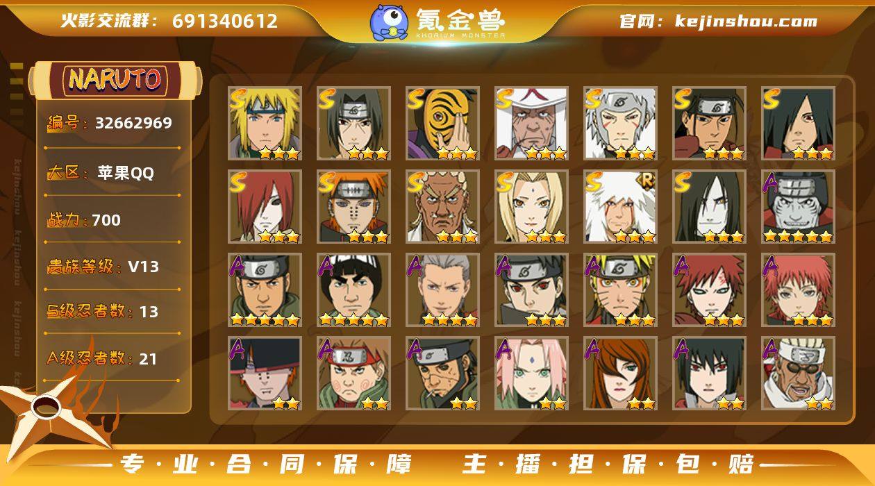 实名: 不可修改 贵族等级: V13 S忍数: 13 A忍数: 21 战力值(万): 700 亮点: 【性价比小号 手慢无】y7176 战力700w 13s 21a 1个198a 48片黄猿 66片自来也 54片金水 60片死水