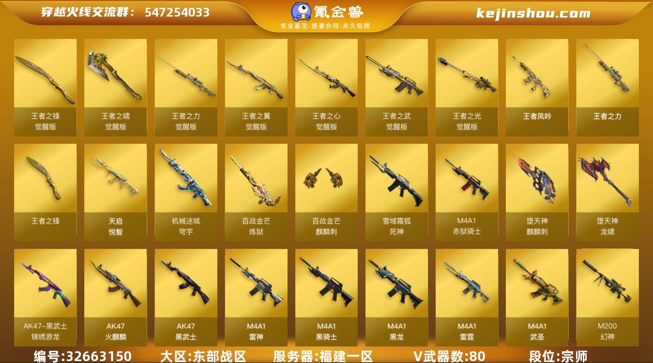 福建一区-90V-12王者武器数-0炫金武器数 【热门武器】:G36C-幻影,QBZ03-金色蔷薇,HK417-朱雀,M200-幻神,M4A1-黑骑士,汤姆逊-烈龙*5,加特林-炼狱,沙鹰-修罗*3 【王者炫金武器】:天启-悦智,王者凤吟,王者之力*2,王者之锋 【音效卡】:AK47-火麒麟音效卡,M4A1-黑骑士音效卡,Barrett-毁灭音效卡,沙鹰-修罗-盛典舞曲音效卡*2,炼狱-百战金芒-庆典舞曲音效卡,死神-雪域霜狐-怀旧音效卡 【皮肤】:幻神-电流骇客 皮肤,雷神-荣耀之魄,雷神-星空,雷神-R.LGD-CFPLS18冠军,M4A1-再燃火线,毁灭-荣耀之怒,毁灭耀金皮肤,毁灭-星空,毁灭-黑大圣皮肤,黑龙-能量核心,黑骑士耀金皮肤,AK47-黑武士-361,战神-流金岁月皮肤,AWM-天龙-传奇70KG,修罗耀金皮肤,修罗-星空,屠龙-荣耀之锋*3,轻型军用手斧-再燃火线 【角色】:零,炫,隼,零·纪元,战地猎狐,雪域霜狐,奇洋探员,乔伊教练,修道士,云海玲珑,葵-阿尔法武装,初恋灵狐,芳心审判者,风暴女,0号玩家,灵狐者-X,灵狐者-黄金海岸,曼陀罗-X,潘多拉-X,潘多拉-甜心教官,潜龙队-X,蜀雪,铁骑荣耀,新娜塔莎,影武者-X,游珑儿 【人偶武器】:AWM-灵狐-15周年嘉年华*2,迷你深渊冰龙*2,迷你裂空之翼,...