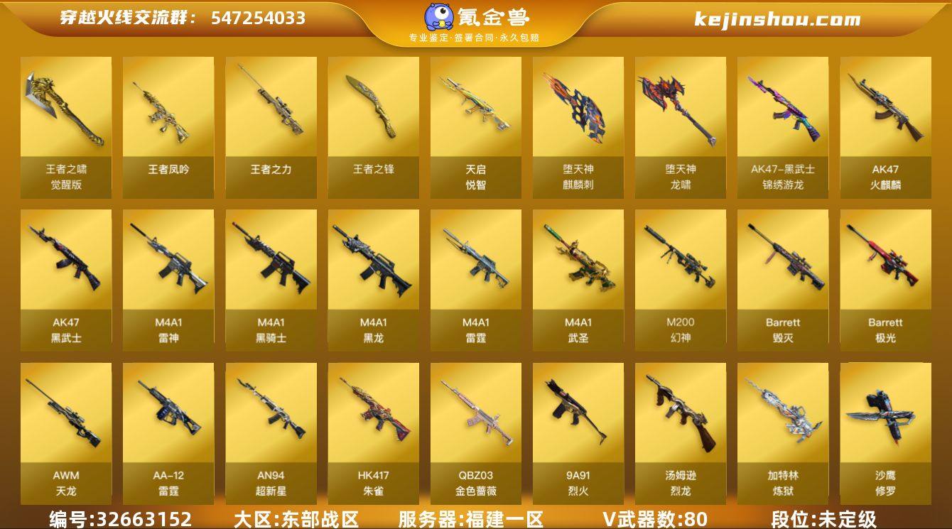 福建一区-90V-12王者武器数-0炫金武器数 【热门武器】:G36C-幻影,QBZ03-金色蔷薇,HK417-朱雀,M200-幻神,M4A1-黑骑士,汤姆逊-烈龙*5,加特林-炼狱,沙鹰-修罗*3 【王者炫金武器】:天启-悦智,王者凤吟,王者之力*2,王者之锋 【音效卡】:AK47-火麒麟音效卡,M4A1-黑骑士音效卡,Barrett-毁灭音效卡,沙鹰-修罗-盛典舞曲音效卡*2,炼狱-百战金芒-庆典舞曲音效卡,死神-雪域霜狐-怀旧音效卡 【皮肤】:幻神-电流骇客 皮肤,雷神-荣耀之魄,雷神-星空,雷神-R.LGD-CFPLS18冠军,M4A1-再燃火线,毁灭-荣耀之怒,毁灭耀金皮肤,毁灭-星空,毁灭-黑大圣皮肤,黑龙-能量核心,黑骑士耀金皮肤,AK47-黑武士-361,战神-流金岁月皮肤,AWM-天龙-传奇70KG,修罗耀金皮肤,修罗-星空,屠龙-荣耀之锋*3,轻型军用手斧-再燃火线 【角色】:零,炫,隼,零·纪元,战地猎狐,雪域霜狐,奇洋探员,乔伊教练,修道士,云海玲珑,葵-阿尔法武装,初恋灵狐,芳心审判者,风暴女,0号玩家,灵狐者-X,灵狐者-黄金海岸,曼陀罗-X,潘多拉-X,潘多拉-甜心教官,潜龙队-X,蜀雪,铁骑荣耀,新娜塔莎,影武者-X,游珑儿 【人偶武器】:AWM-灵狐-15周年嘉年华*2,迷你深渊冰龙*2,迷你裂空之翼,...
