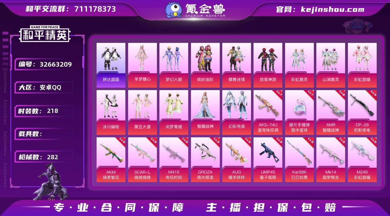 【940224】安卓 手Q-13粉装-13特效枪-0载具-8粉色飞行器-92650热力值-13王牌印记-218套装-282枪皮 【热门品类】:粉装-梦幻火箭,粉装-缤纷油彩,套装-浪漫天命,套装-胖达圆圆,套装-龟仙人,套装-潮萌小黄鸭,套装-暗影哥特,套装-红红火火,角色-Mark.06,套装-红熊茄茄 【粉色套装】:粉装-蝶舞迷情,粉装-梦幻火箭,粉装-缤纷油彩,粉装-放客神游,粉装-彩虹鹿灵,粉装-山涧鹿灵,粉装-彩虹甜喵,粉装-冰川幽秘,粉装-第五大道,粉装-闲梦青缨,角色-智耀战神,粉装-幻彩电音,角色-羊梦糖心 【粉色枪皮等级】:AKM-绿萝繁花(五级),SCAR-L-锦绣绵绵(五级),M416-电玩时刻(五级),GROZA-镜光银凌(五级),AUG-暖羊咩咩(五级),UMP45-量子极限(五级),AKS-74U-星穹咏叹调(七级),Kar98K-巳巳如意(五级),Mk14-甜梦熊击(五级),AMR-智耀战神(六级),M249-彩虹甜喵(五级),DP-28-豹影疾电(五级),破片手榴弹-瓶中星球(七级) 【粉色枪皮】:AKM-绿萝繁花,SCAR-L-锦绣绵绵,M416-电玩时刻,GROZA-镜光银凌,AUG-暖羊咩咩,UMP45-量子极限,AKS-74U-星穹咏叹调,Kar98K-巳巳如意,Mk14-甜梦熊击,AMR-智耀战神,M249-彩虹甜喵,DP-28-豹影疾电,破片手榴弹-瓶中星球 【粉色飞行...