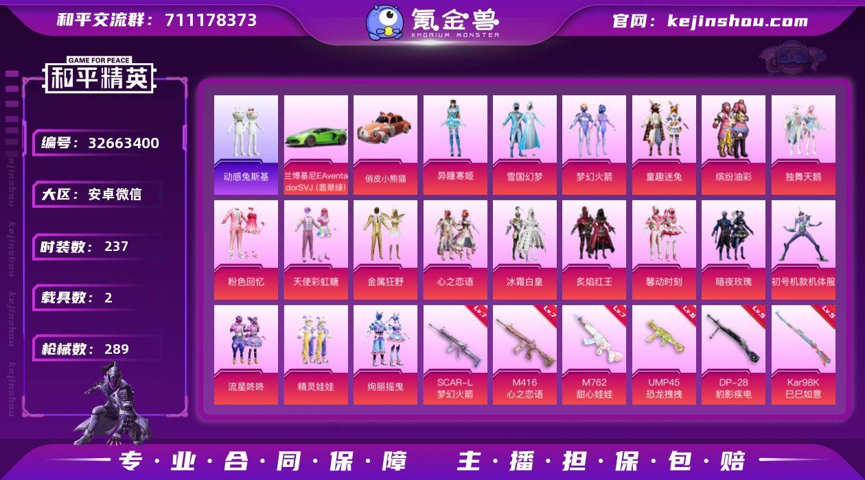 【店主推荐捡漏号!可直接换绑】安卓 微信-18粉装-10特效枪-2载具-3粉色飞行器-99281热力值-34王牌印记-237套装-289枪皮 【热门品类】:粉装-雪国幻梦,粉装-梦幻火箭,粉装-童趣迷兔,粉装-缤纷油彩,套装-浪漫天命,角色-军刀雅典娜,套装-动感兔斯基人偶服,套装-SS1特训,套装-龟仙人,套装-暗影哥特,套装-粉红小猪 【粉色套装】:粉装-独舞天鹅,粉装-粉色回忆,粉装-天使彩虹糖,粉装-雪国幻梦,粉装-梦幻火箭,粉装-金属狂野,粉装-缤纷油彩,粉装-心之恋语,粉装-冰霜白皇,粉装-童趣迷兔,粉装-炙焰红王,粉装-馨动时刻,粉装-暗夜玫瑰,角色-初号机款机体服,粉装-流星咚咚,粉装-精灵娃娃,粉装-绚丽摇曳,角色-异瞳寒姬 【粉色枪皮等级】:SCAR-L-梦幻火箭(七级),M416-心之恋语(七级),M762-甜心娃娃(七级),UZI-绮梦青鸾(四级),UMP45-恐龙拽拽(六级),Kar98K-巳巳如意(五级),Mk14-福马献瑞(五级),SLR-暗夜玫瑰(四级),DP-28-幻梦音符(四级),DP-28-豹影疾电(五级) 【粉色载具】:兰博基尼Aventador SVJ(翡翠绿),俏皮小熊猫 【粉色枪皮】:SCAR-L-梦幻火箭,M416-心之恋语,M762-甜心娃娃,UZI-绮梦青鸾,UMP45-恐龙拽拽,Kar98K-巳巳如意,Mk14-福马献瑞...