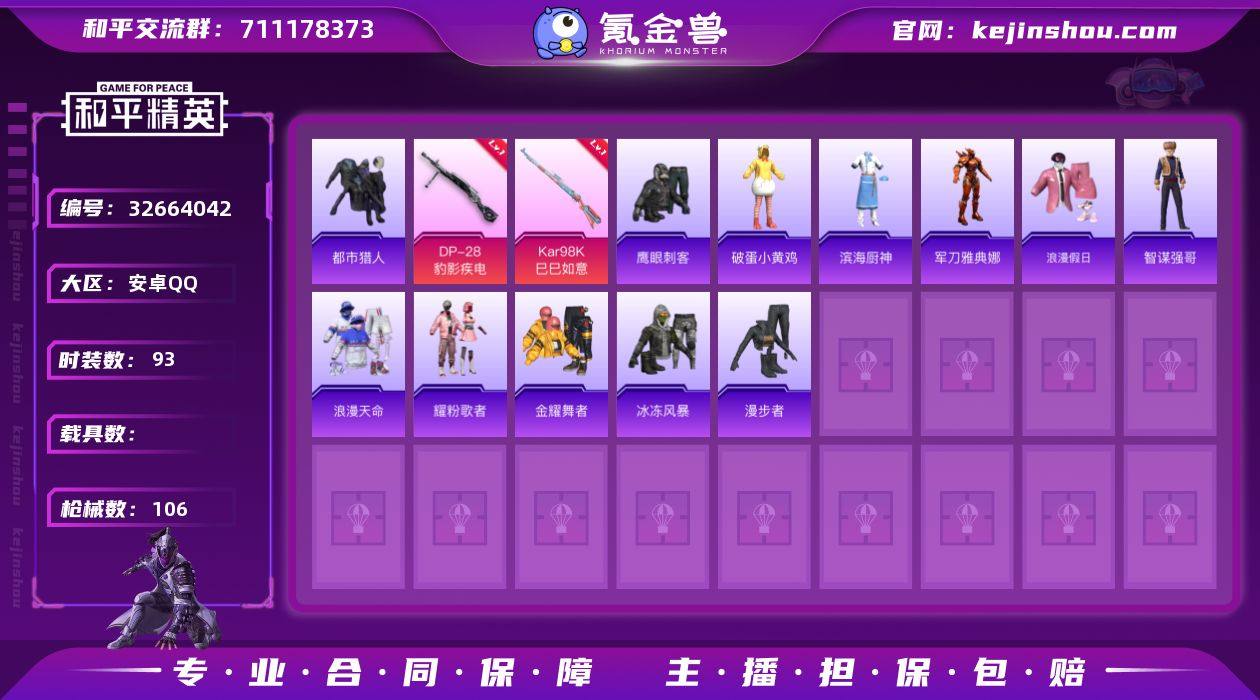 DSH2432【可二次4特 红眼罩 浪漫天命 都市猎人】安卓手Q-4特效枪-93套装-106枪皮-4王牌印记-超级王牌-29604热力值【4特效枪】Mk14-福马献瑞[5级],DP-28-豹影疾电[5级],ACE32-萌骑漫游[4级],Kar98K-巳巳如意[5级]【5稀有】都市猎人,暗影哥特,浪漫天命,M762-奇异狩猎者,M24-奇异狩猎者【4飞行器】狂鲨锋刃飞行器,鸡智如我飞行器,顶峰精英尾迹,马上有福飞行器【1头盔】金羽特工头盔【190其它衣服和枪皮】白色伏地魔,燕燕于飞,元素星魂,竞技名士,SS33特训,海岛探路者,光之冒险,金耀舞者,吉莉礼服,大橘大利,橘黑制服,冰川格斗者,惊鸿侠骨,老实芭蕉,疯狂小兔子,浪漫假日,王牌教练,幻影武者,探宝勇士,长空猛禽,SS35特训,特战装甲,耀粉歌者,恋语绒绒,街头潮人,白糯汤圆,鹤鸣,猛禽,潮流炫酷,锦衣飞扬,雨过天青,SS30特训,森林游猎者,破蛋小黄鸡,星途旅人,鹰眼刺客,红釉青花,蓝色运动,冷焰舞者,巳巳如意,SS31特训,特训学院,玩偶服-美羊羊,福马献瑞,魅力单车,SS32特训,缤纷果语,玲珑侠影,香桃花海,SS21特训,SS34特训,SS25特训,SS27特训,黑色伏地魔,SS20特训,SS37特训,春日漫步,娇憨猪猪,鱼渊荷华,黄色运动,竞技达人朋克,猎鹰,黄色伏地魔,湖蓝色名流,智谋强哥,甜心亚梦,红色运动,幻世战舞者...