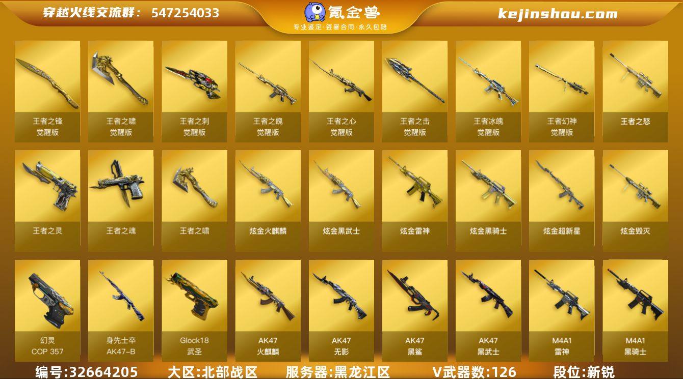 黑龙江区-138V-16王者武器数-7炫金武器数 【热门武器】:QBZ03-金色蔷薇*5,Scar Light-白虎,M200-幻神,死亡之眼*3,Kar98K-星神,M4A1-黑骑士,汤姆逊-烈龙*6,RPK-盘龙*6,加特林-炼狱*3,斯泰尔-蝴蝶,雷神-小红,COP 357-幻灵,沙鹰-修罗*3,黄金猫猫手套-白鲨 【王者炫金武器】:王者之怒,王者之灵,王者之魂,王者之啸*2,王者之魄高爆手雷,王者之魄烟雾弹,炫金火麒麟,炫金骑士*2,炫金雷神,炫金武士,炫金超新星,炫金毁灭 【音效卡】:AK47-火麒麟音效卡,M4A1-雷神音效卡,Barrett-毁灭音效卡,QBZ03-金色蔷薇音效卡 【皮肤】:幻神-丹凤,QBZ03-冠军之薇,雷神-暗月,雷神-荣耀之魄,雷神-虎将,雷神-耀金皮肤,AK47-火麒麟-传奇EVEN,火麒麟-轻羽皮肤,火麒麟-战神关羽,火麒麟-百城,火麒麟-心动糖果,毁灭耀金皮肤,毁灭-星空,毁灭-战神张飞,黑龙-墨子皮肤,黑骑士-战神马超,战神-粉色甜心皮肤,战神-紫绶金章皮肤,战神-流金岁月皮肤,AK47-B-常胜将军-刘备,AK47-B-常胜将军-孙权*2,AWM-天龙-传奇70KG,修罗-能量核心,修罗-冠军之魂,屠龙-荣耀之锋,擎天-秘银 【角色】:葵,樱,炫,王者春,风暴女,娟娟,灵狐-花神,灵狐者-职业经理,斯沃特-X...