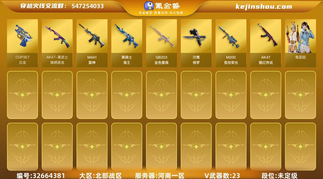 DSCF631【可二次 竞技荣光】【等级】88【区服】河南一区【英雄角色】0【英雄武器】23【英雄级武器】M4A1-苍鸣雷神 M4A1-雷神 QBZ03-金色蔷薇 沙鹰-修罗 沙鹰-修罗 沙鹰-修罗 闪光弹-云龙 高爆手雷-云龙 COP 357-云龙 雷霆之锋 高爆手雷-雷霆 烟雾弹-雷霆 闪光弹-雷霆 黑武士-锦绣游龙 黑骑士-海王 龙啸-烈火龙威 无影-神兵利器 烟雾弹-竞技荣光 M200-竞技荣光 高爆手雷-竞技荣光 闪光弹-竞技荣光 AK-47-猩红传说 黑骑士-海王【源级武器】魂·雷神-蓝风铃 魂·QBZ03·金色蔷薇-序章 源·毁灭 源·雷神 魂·雷神-神秘按键 魂·炼狱- 迷彩 灵·黑骑士-破界 I 源·屠龙 魂·9A91·烈火-电子连击 灵·HK417-朱雀-甜蜜火力 I 源-黑龙 源-极光 魂·修罗-神兵利器 源·毁灭 魂·屠龙-春桃 源·Barrett-朱雀 魂·擎天-破浪10年 魂·炼狱-月 魂·雷神-15周年嘉年华 魂·修罗-15周年嘉年华 源·屠龙 魂-雷神-萌杀 魂·火麒麟-百城 御·毁灭-葫芦兄弟 【挑战级武器】神圣爆裂者-末日III 冰龙粉碎者-白马银枪 迷你深渊冰龙 激光毁灭者III 【精英级武器】9A-91-天蝎座 【通用级角色】灵狐者-X 潘多拉-X 暗夜-X 娟娟 风暴女 齐天大圣 奥摩-X 剑齿虎-X 圣诞潘多拉-X 飞虎队-X 虎妞 猎狐者-Y 龙儿-小淘气 葵-赛博朋克...
