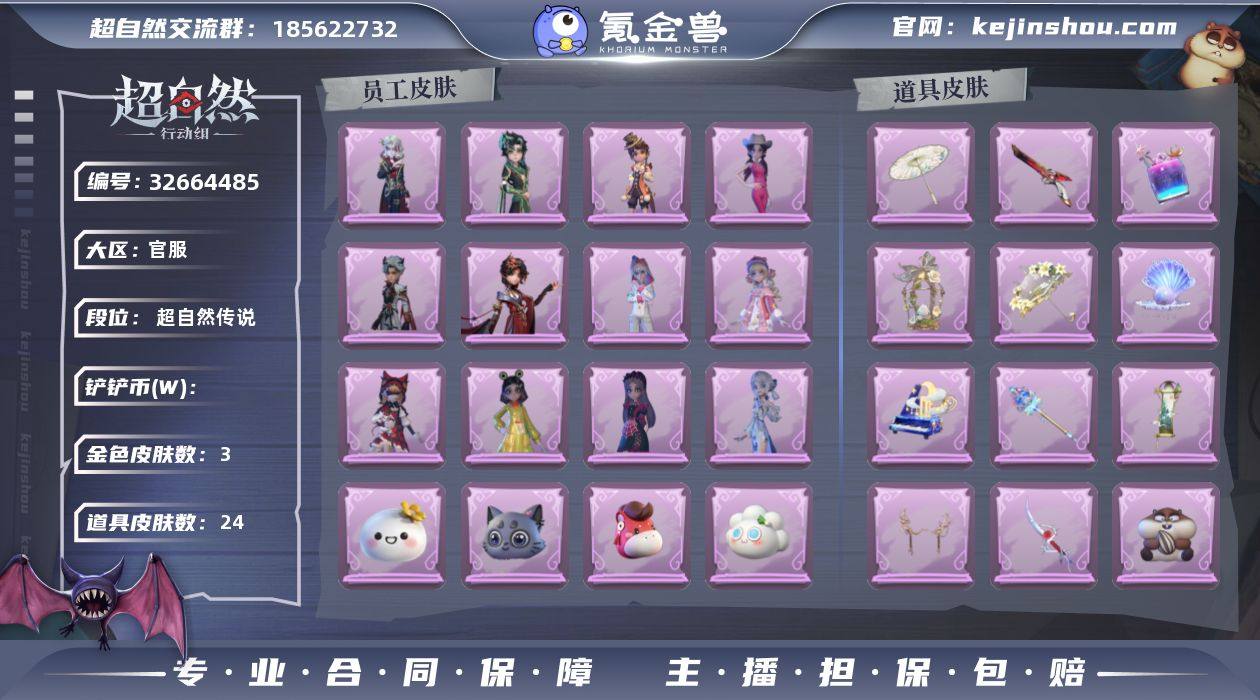 紫皮12;道具皮24;皮肤:零-磨砺成锋,爱德华-梵卓之礼,小黄-呱呱雨衣,艾伦-黎明猎手,阿念-庆宴绮愿,爱丽丝-耀眼的你,艾伦-绒绒对决,薇薇安-仙锋小姐,爱丽丝-甜梦派对,莉莉-莓果陷阱,巫铃儿-素影瑶光,爱丽丝-丝缕哀歌;道具:传送按钮-逆时审判,音响-月光奏鸣曲,伞-沐春颂,长鞭-新春炸响,闪光弹-金戈玄铜,长鞭-缚誓之锁,急救包-蔷薇物语,转轮手枪-新星时代,腰包-红运福虎,黄牛能量饮料-星空特调,腰包-惊魂娃娃,夜视仪-敛花容,葫芦-海心凝珠,音响-咏叹调,音响-鸣沙鼓,短管猎枪-安魂曲,电击枪-权杖的许诺,长枪-罪棘,伞-郁金春信,刺刀-铂刺与红萼,急救包-土拨鼠捏捏,传送按钮-浮生一梦,腰包-宝剑八,伞-伞;美妆:美妆-暗夜小恶魔;饰品:头饰-煤球喵头套,头饰-烛光纪念,头饰-樱桃奶油布丁,头饰-哈士奇头套,头饰-小财神豚豚头套,头饰-炙热烧烤,头饰-嘻嘻头套,头饰-滑稽头套,头饰-芝麻糊汤圆,头饰-小狗蛇点点头套,头饰-饺饺者头套,头饰-马上有钱,头饰-太空鲨头套,头饰-鱼头怪头套,头饰-咬咬鲨头套,头饰-萨卡班甲鱼头套,头饰-面具马头套,头饰-蒜了八,头饰-卑微头套,头饰-烈焰红唇头套,头饰-火爆了头套,头饰-呆滞头套,头饰-像素朋克墨镜,头饰-后室幸存者头套,挂饰-未竟乐园,挂饰-晚安...