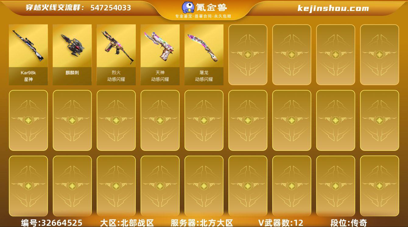 北方大区-14V-0王者武器数-0炫金武器数 【热门武器】:Kar98K-星神 【角色】:乔伊教练,暗夜-X,风暴女,嘉年华灵狐,麻雀,曼陀罗-X,潘多拉-X,潘多拉-甜心教官,夜玫瑰-宠粉 【人偶武器】:AWM-灵狐-15周年嘉年华,生化手雷-机甲核心 【挑战大师】:激光毁灭者III-白马银枪 【英雄级武器】:烈火-动感闪耀,Kar98K-星神,天神-动感闪耀,麒麟刺,屠龙-动感闪耀,手雷-动感闪耀 【道具】:云山科技背包,炫彩背包,女皇终结者-魔龙之吻,救世主-黑桃战神,绿色巨人,灵魂忍者,迷雾幽灵,夺命之镰,防化服*2,金色流光-枪王排位*2,星辰流光-枪王排位,动感闪耀表情,防弹头盔*3,防弹衣*3,C4工具钳*2,手雷包*2 【特殊枪械】: